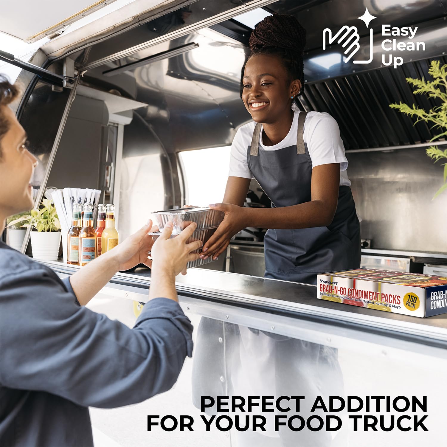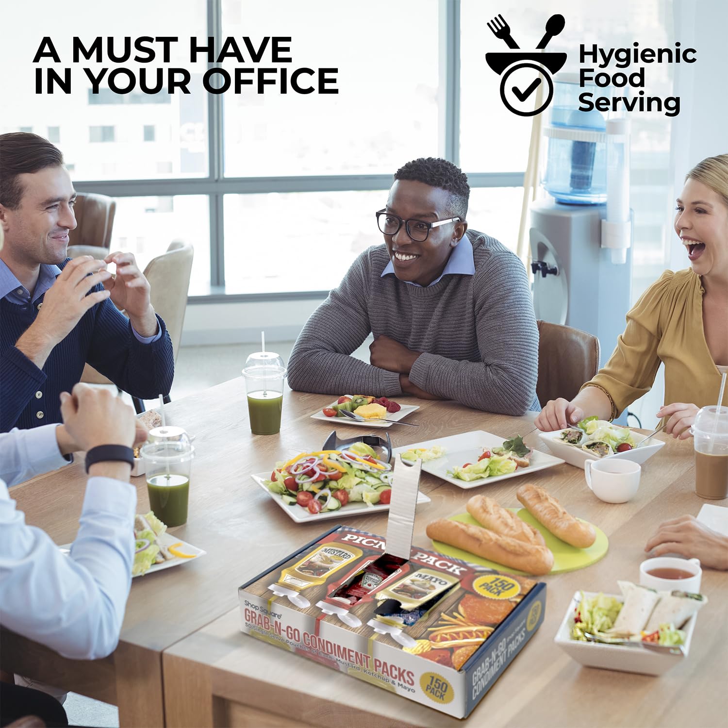 Convenient Dispenser Box: Our 150-pack of ketchup, mustard and mayo packets come in a handy dispenser box, making it easy to grab what you need without the hassle of loose packets. Perfect for quick access and organized storage in kitchens, break rooms, or during catering events.