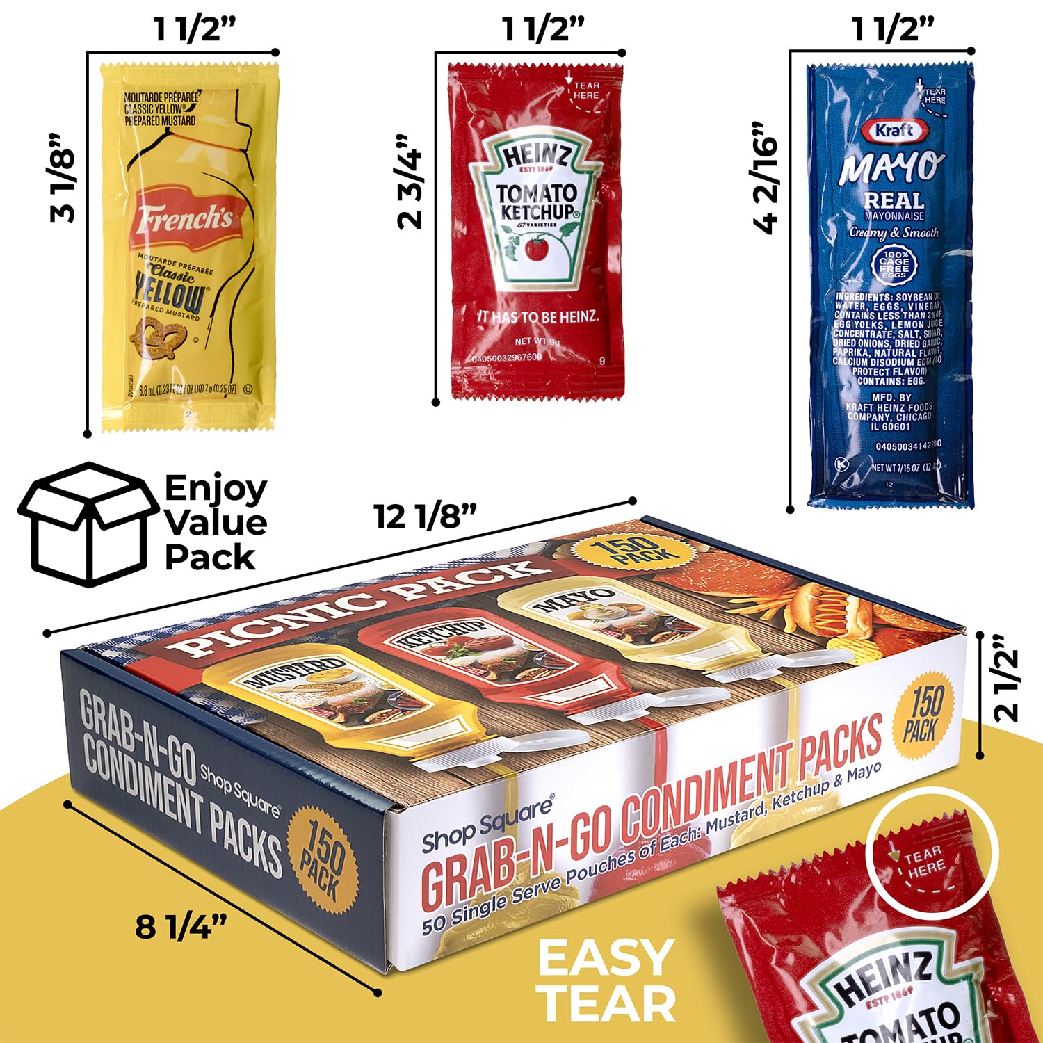Grab-n-Go Condiment Packs with Spreader – 50 Single Serve Pouches of Each: Ketchup, Mustard, and Mayo – 150 Pack, Dispenser Box, Great for Picnics, Boxed Lunch, BBQ, Travel, and Parties