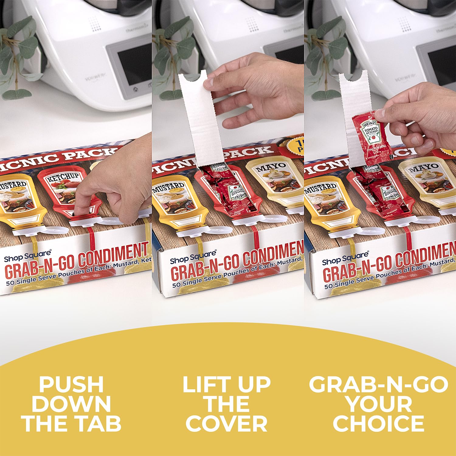 8 reviews for Grab-n-Go Condiment Packs with Spreader – 50 Single Serve Pouches of Each: Ketchup, Mustard, and Mayo – 150 Pack, Dispenser Box, Great for Picnics, Boxed Lunch, BBQ, Travel, and Parties