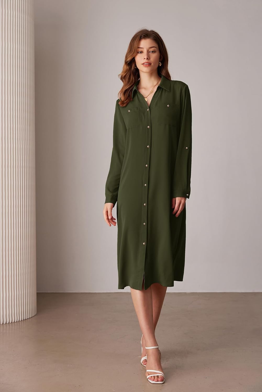 ———The sleeve length is adjustable; you can wear it as a long-sleeve dress when the weather is cool, or as a 3/4 sleeve dress when it’s warm. The two pockets on the chest are faux pockets, but if you cut off the buttons, they become real pockets.
