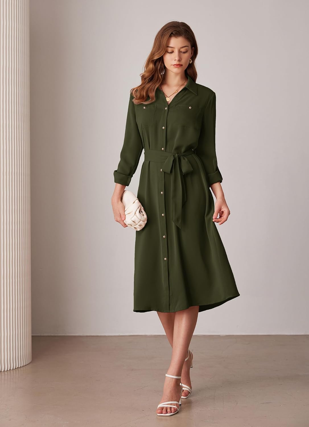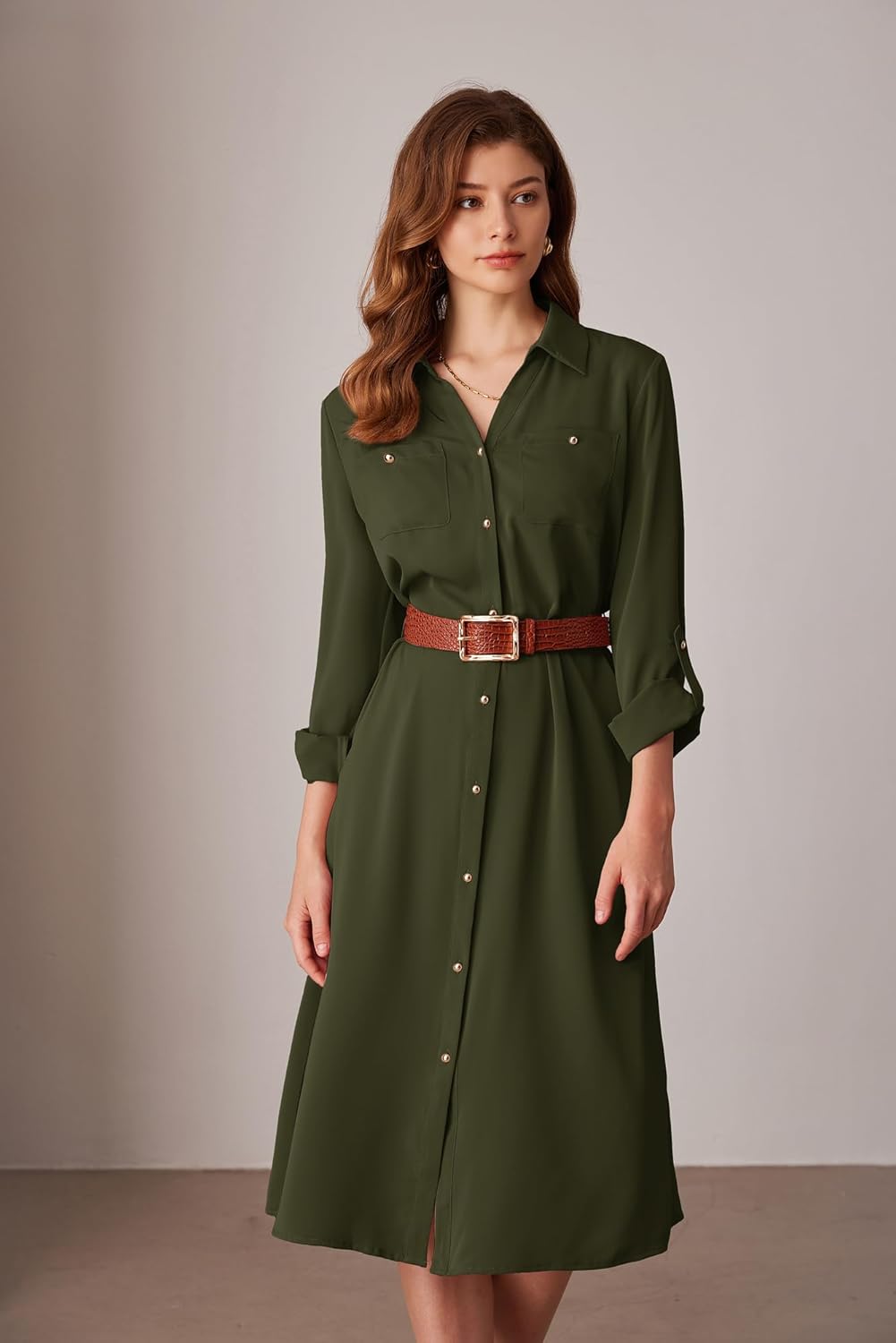 GRACE KARIN Women Casual Shirt Dresses Adjustable Sleeve Belted Midi Dress