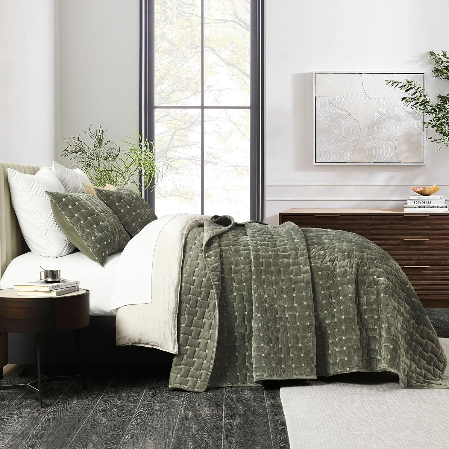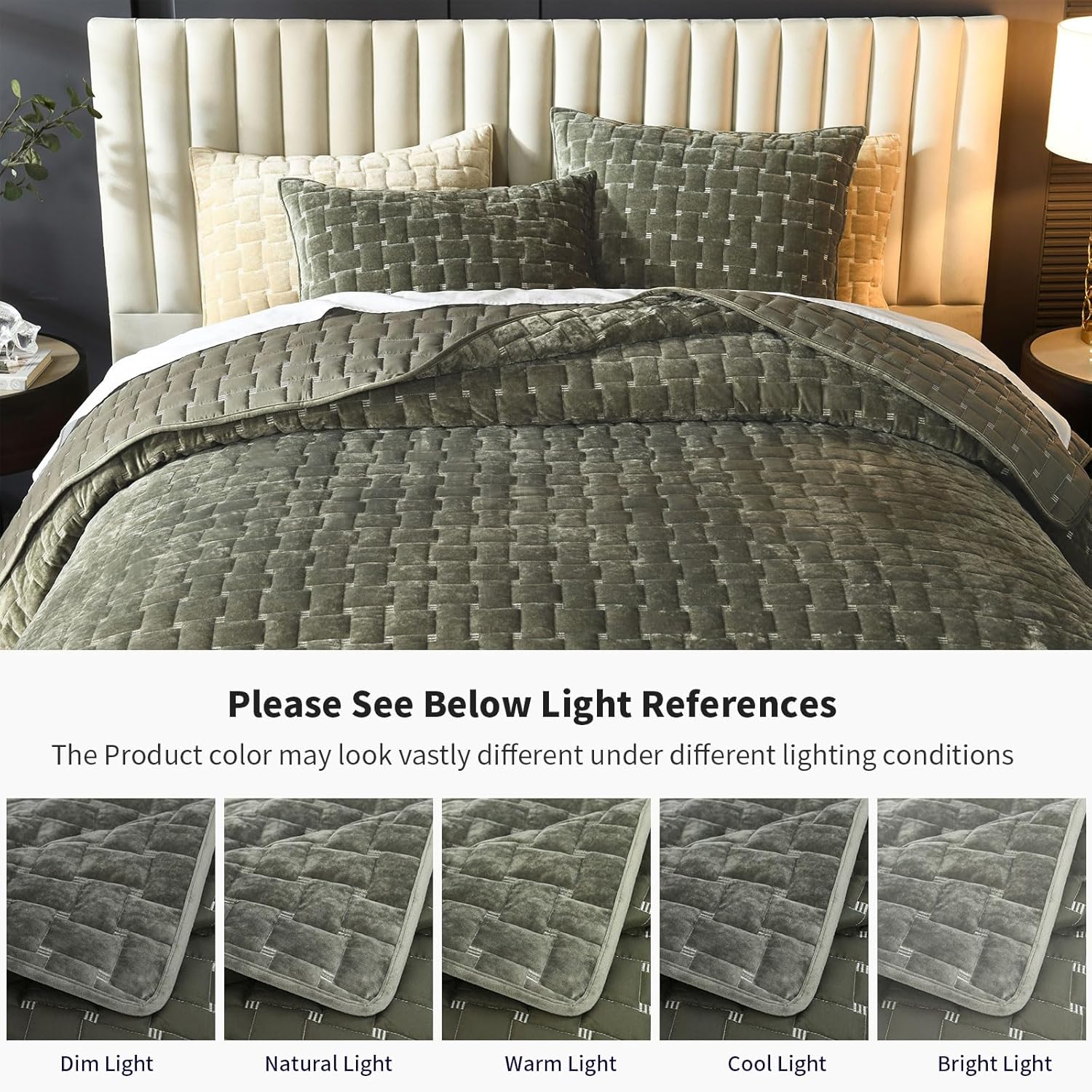 Grassix Velvet Quilt King Size – Luxe Olive Green Quilt Set, Lightweight Velvet Comforter Soft, Geometric Coverlet Bedspreads with 2 Shams, 3 Pieces, Perfect for House Warming Gift, All Season