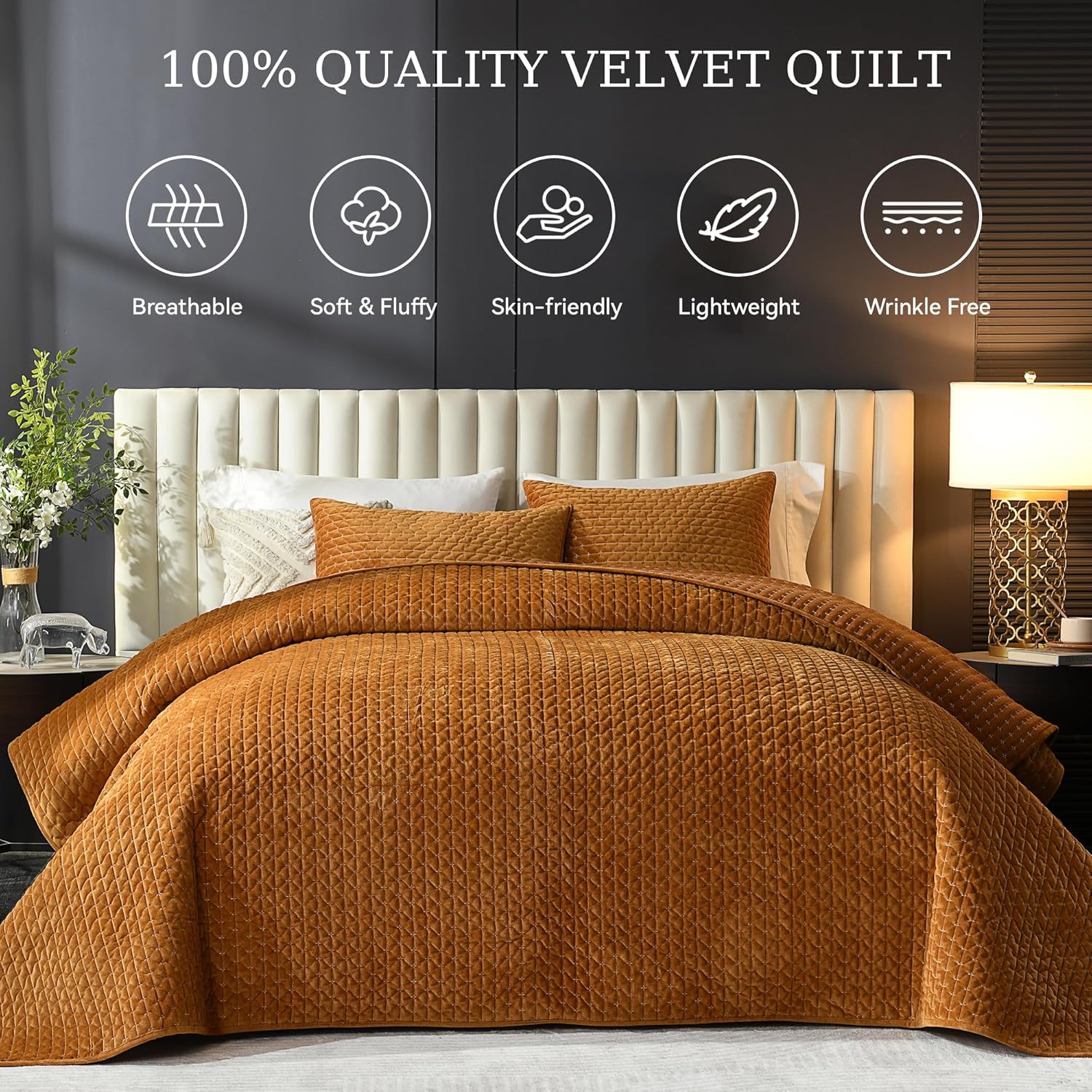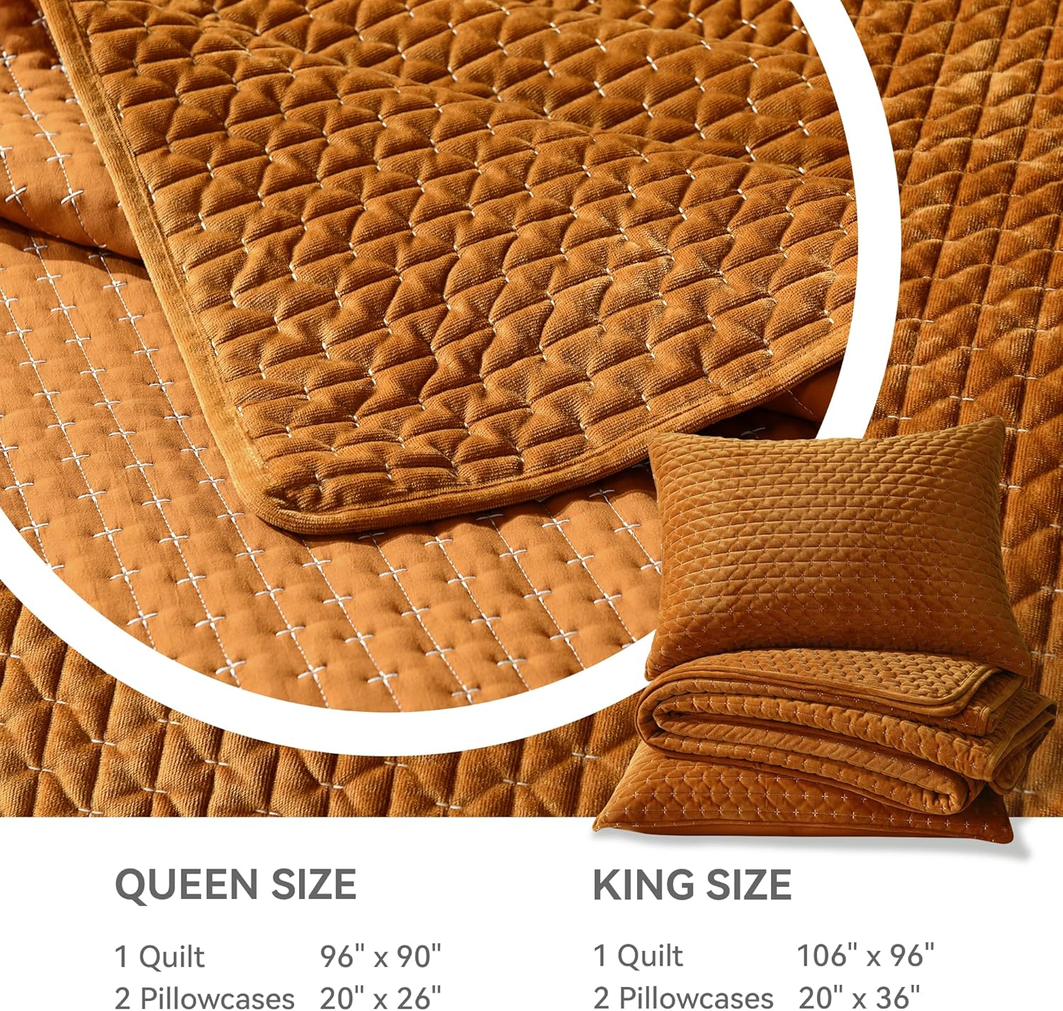 Grassix Velvet Quilt Set King Size – Luxury Cozy Velvet Quilt Bedding Set, Lightweight Velvet Comforter for All Season, Cross Stitch Coverlet Bedspreads with 2 Shams, Gold Caramel