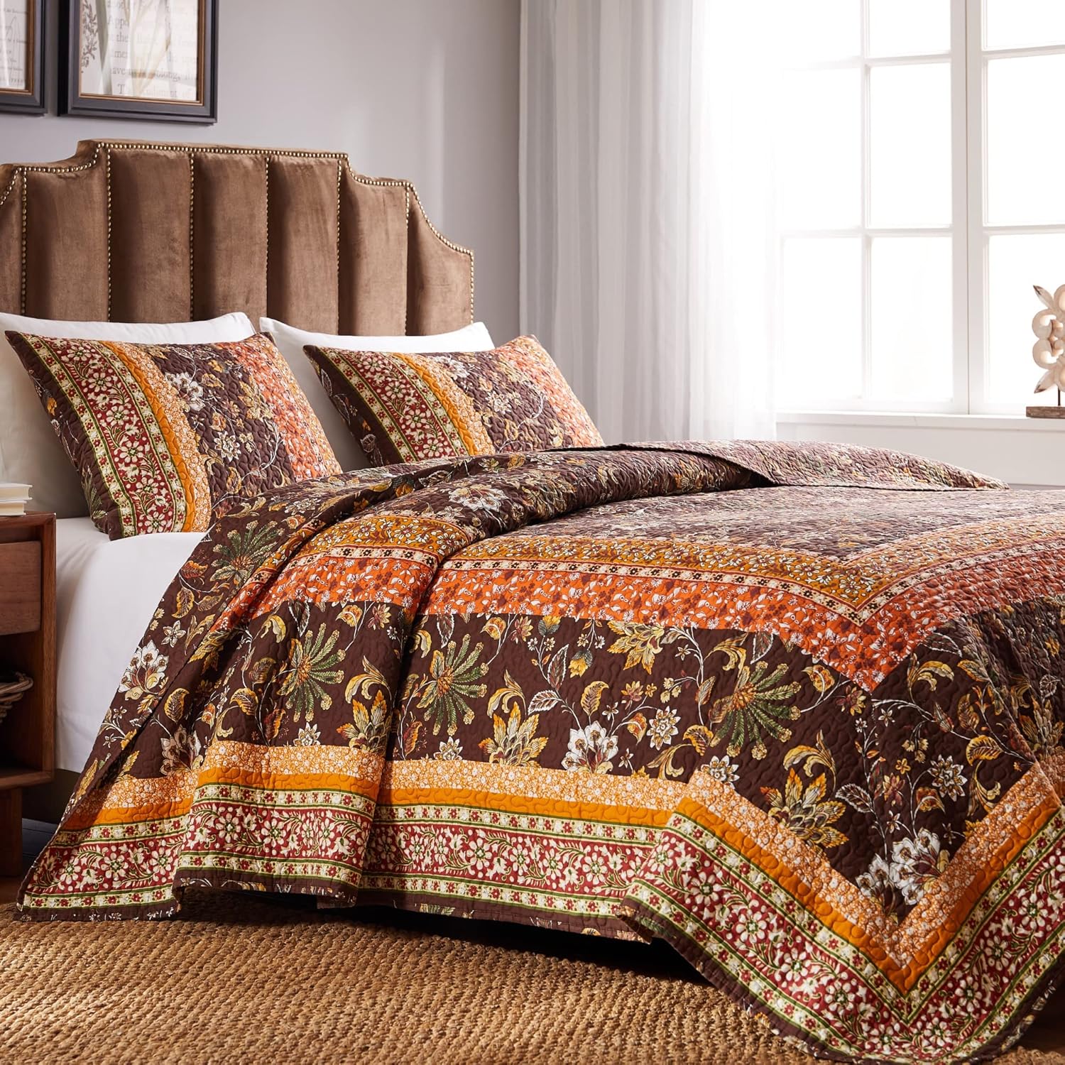 Greenland Home Barefoot Bungalow Audrey Reversible Quilt Set, 3-Piece King/Cal King, Chocolate