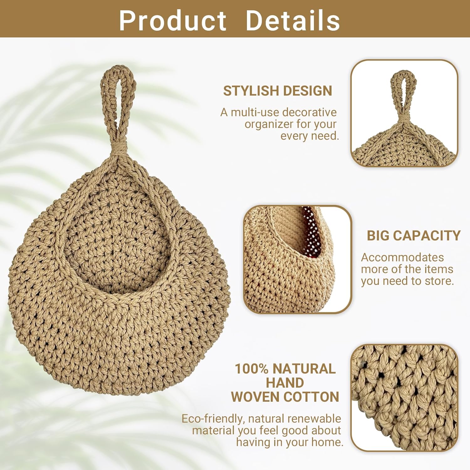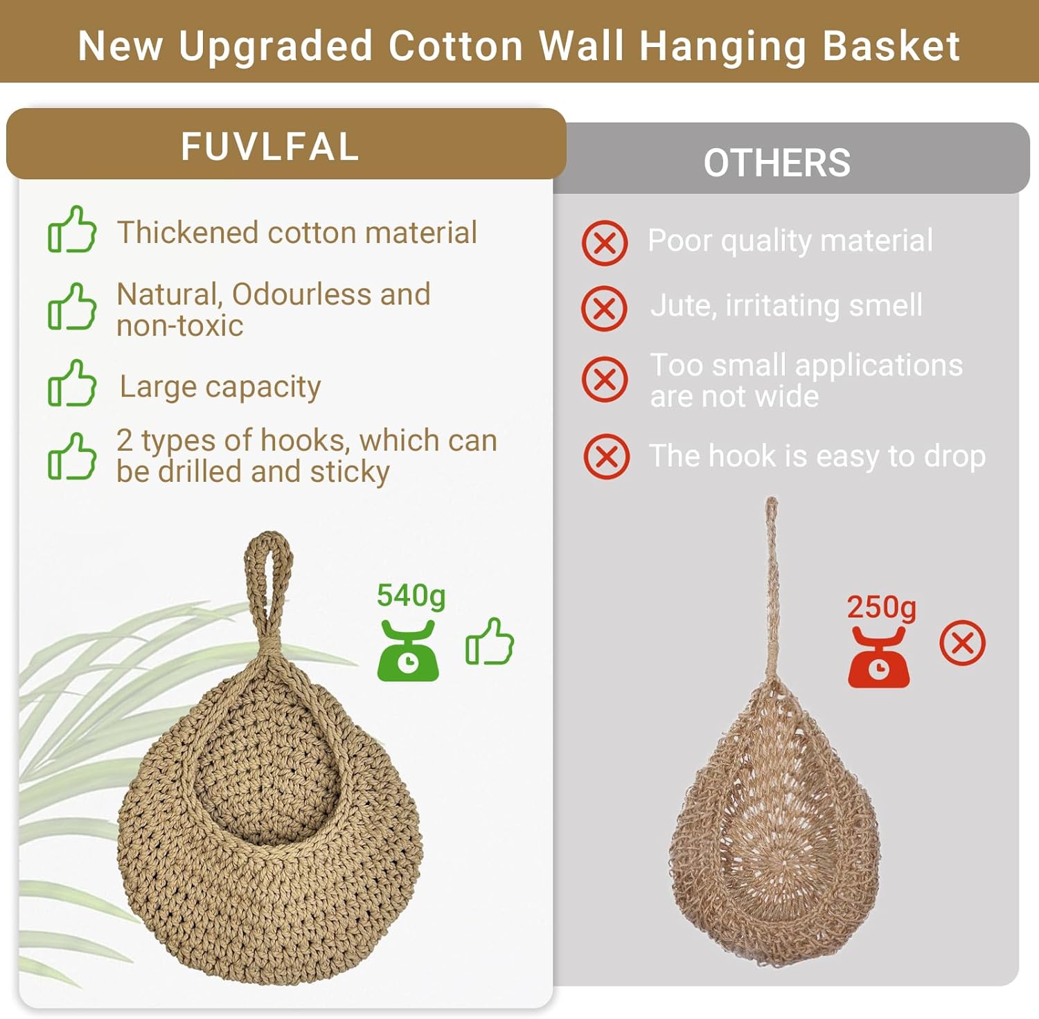 【Large Capacity & Sturdy and Durable】We upgraded the storage opening, which can hold more items than traditional jute hanging baskets. All of the hanging wall baskets feature tall front pockets to securely hold more fruits and veggies without them falling over! It is a perfect choice to use as fruit basket, onion storage, potato storage, snack organizer, etc