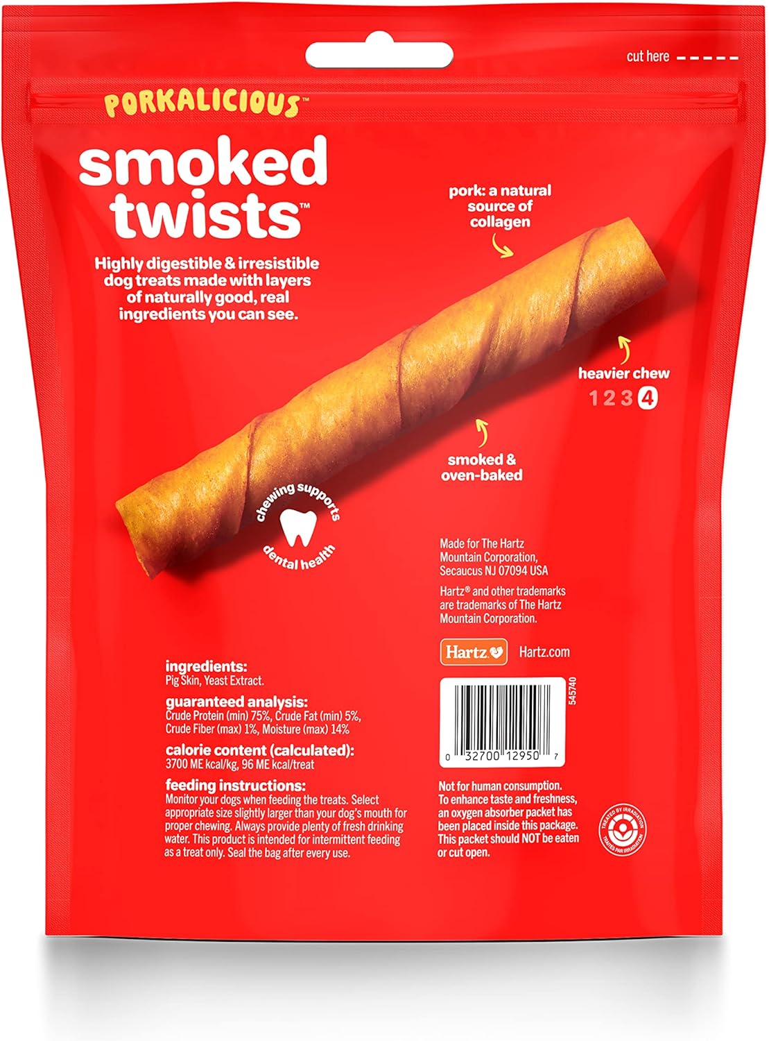 Hartz Oinkies Porkalicious Smoked Twists are highly digestible and irresistible dog treats made with layers of naturally good, real ingredients you can see. Without any beef rawhide, these Oinkies dog treats are made with real pigskin, which is a natural source of collagen. These dog chew treats are smoked and oven-baked to lock in that delicious flavor your dog will go crazy for! Oinkies Smoked Twists are considered a heavier chew.