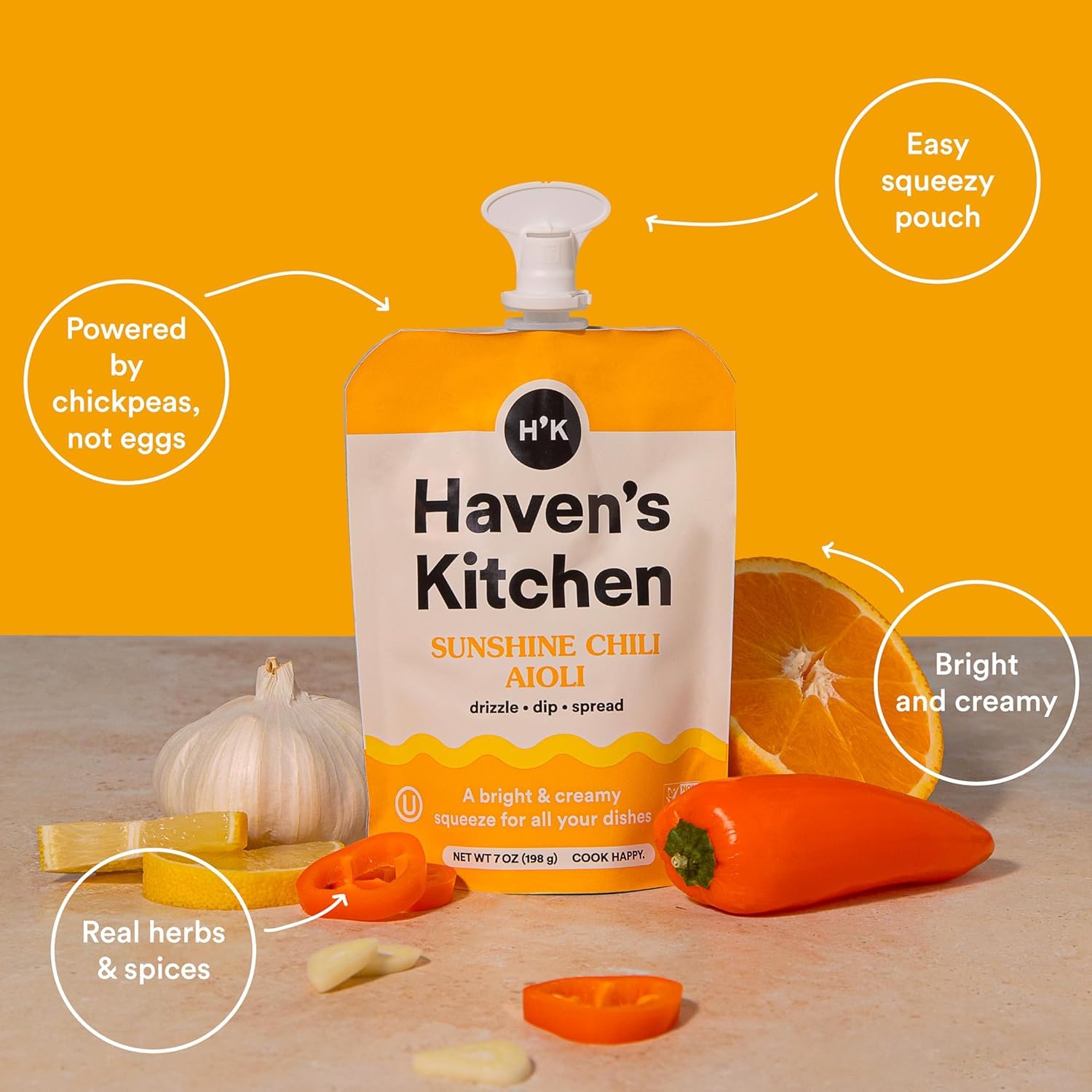VEGAN & CHICKPEA POWERED: Haven’s Kitchen Sunshine Chili Aioli is a unique take on traditional aioli, using chickpeas as the primary ingredient instead of eggs. This plant-powered alternative ensures a creamy, silky-smooth texture while catering to those with dietary preferences or restrictions 🌱.