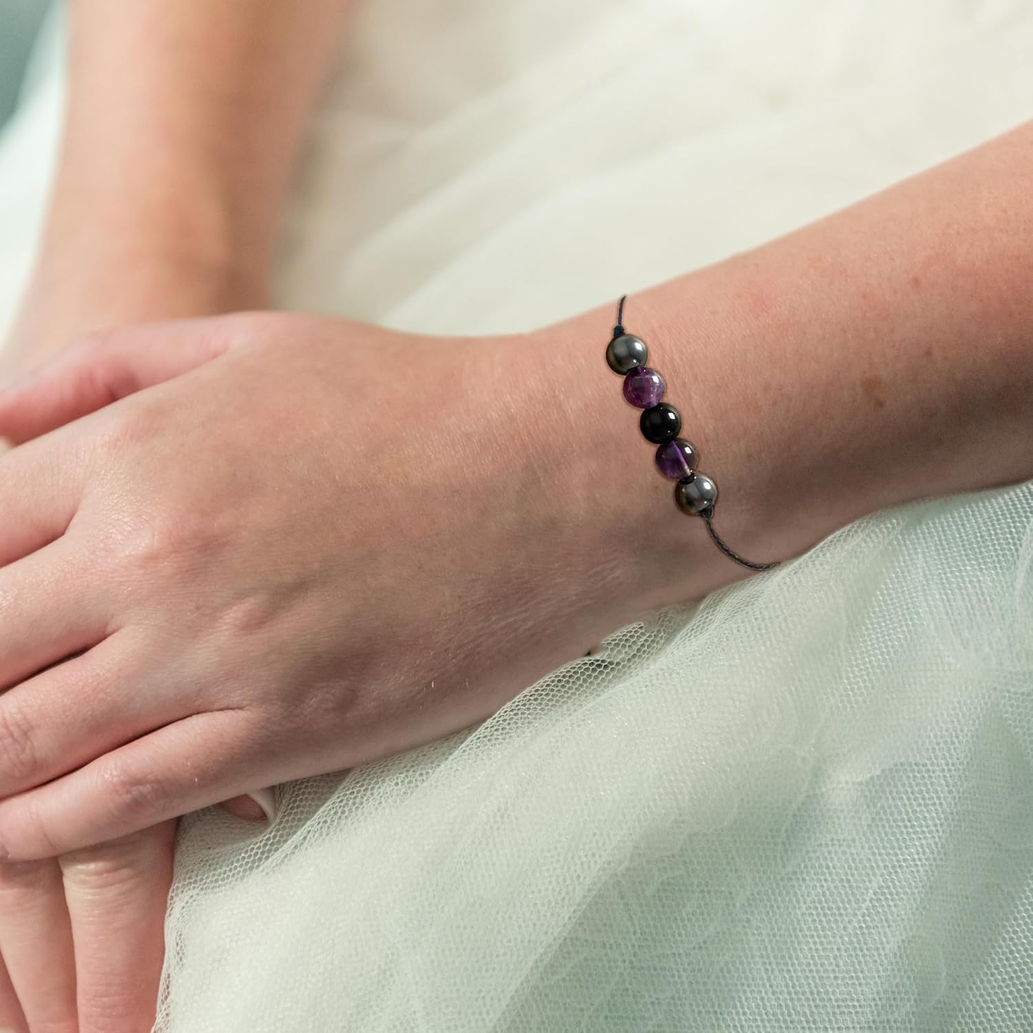 Crafted from 100% natural stone beads , the Amethyst’s deep purple hues evoke tranquility, soothing anxiety while fostering empathy and intuition. Labradorite, with its iridescent flashes, stimulates imagination and guards against negativity. The warm tones of Tiger’s Eye ground the wearer, promoting confidence and protection.