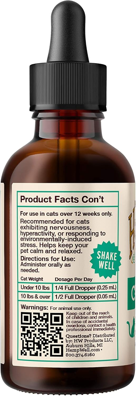 Calming Care for Cats: Hemp Well Calm Oil provides natural anxiety relief and relaxation aids for cats. May assist with separation anxiety, trainability, and cat urination deterrent.
