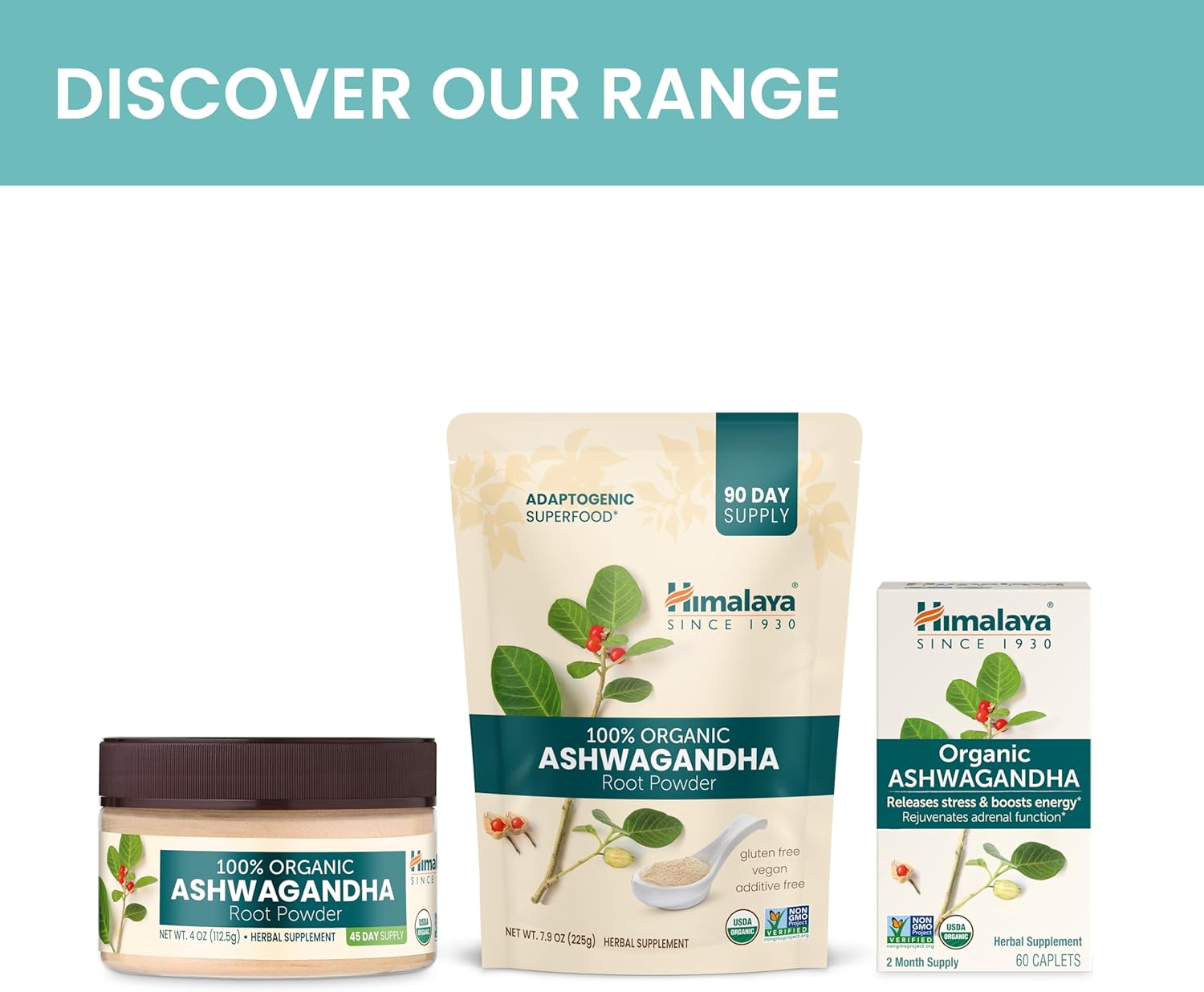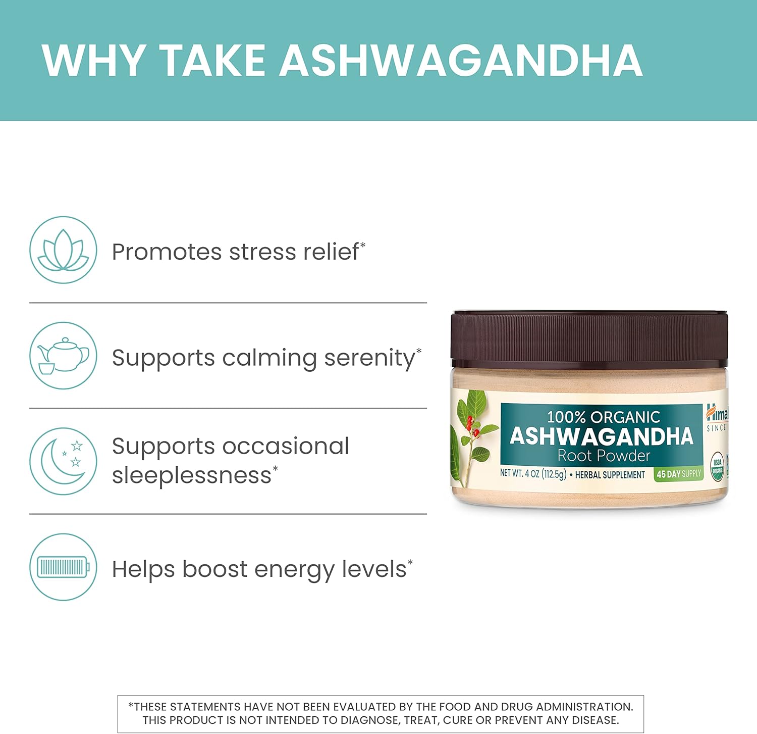 Himalaya 100% USDA Certified Organic Ashwagandha Root Powder Herbal Supplement, Supports Relaxation, Stress Relief, Energy, Occasional Sleeplessness, Non-GMO, Vegan, Flavorless, 4 Oz, 45 Day Supply
