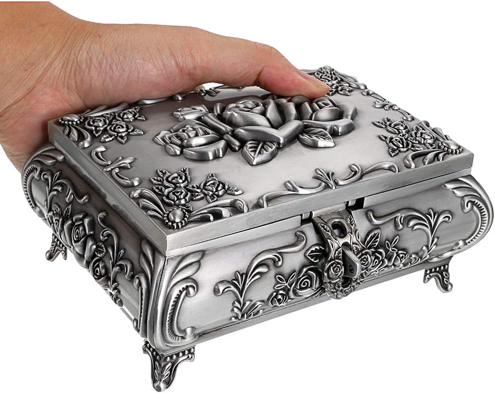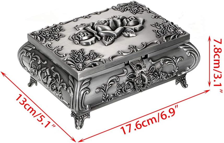 MATERIAL-This vintage jewelry box is made of premium zinc alloy which is long-lasting,anti-oxidize,rustless and it will never fade. Soft elegant velvet on the inside,protects jewelry from dust and scratches,pretty trinket box to the top of your dresser,it always keeps your jewelry organized and elegant
