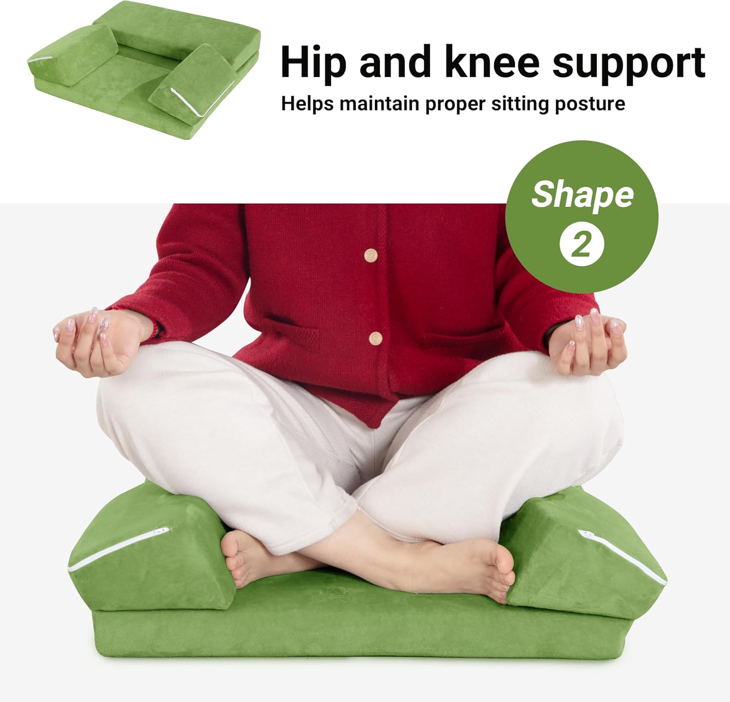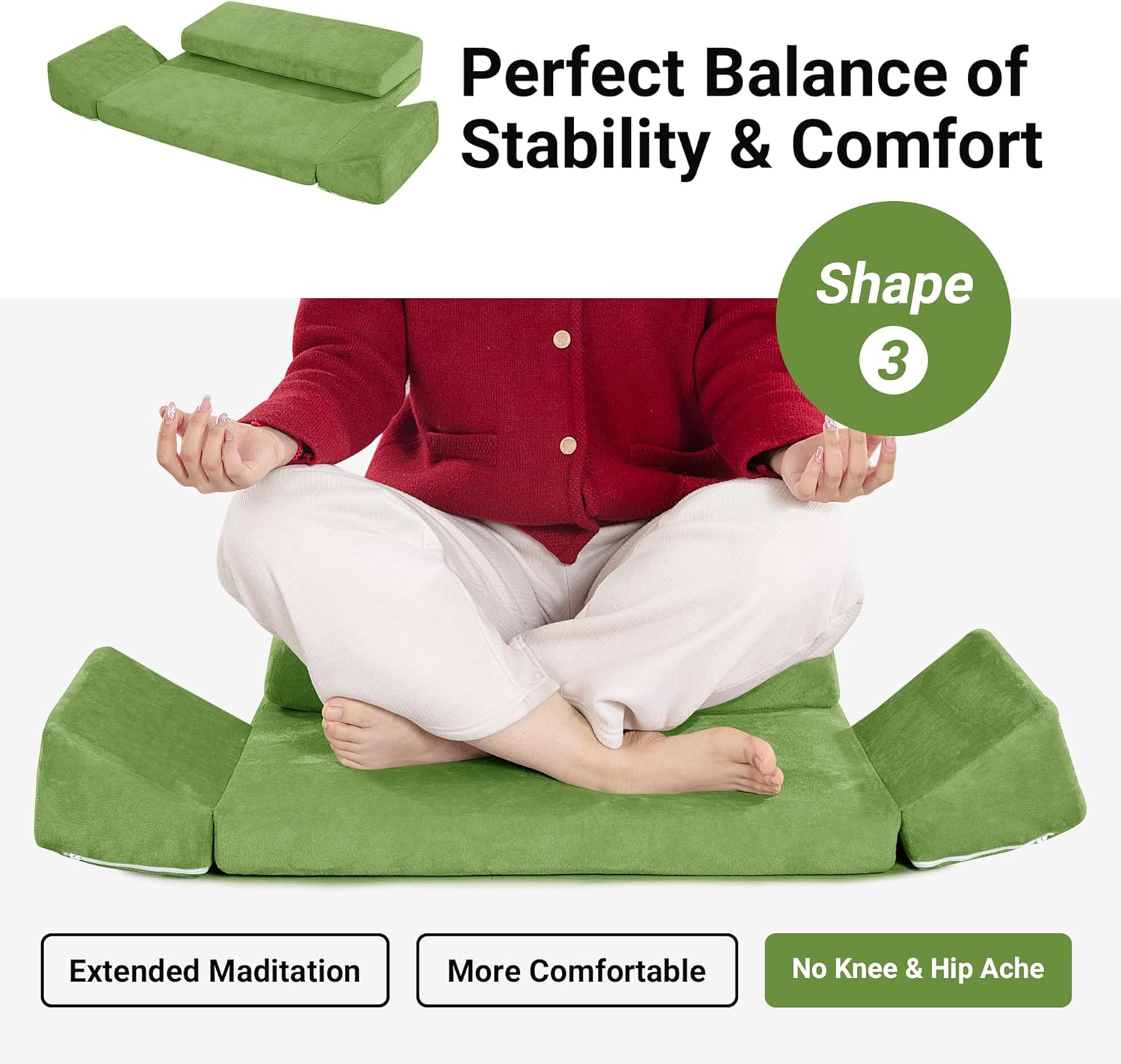 【3 Shapes】3 shapes are designed for meditators at different stages of meditation, easily change the shape by folding and lowering the knee cushion and hip support cushion. The spread base shape is designed for experienced meditators, meditation beginners can use the knee & hip support cushions.