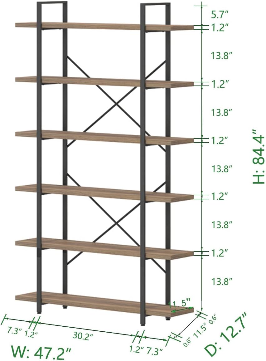 【Sturdy Construction】: Constructed with high-quality MDF board and thick steel metal frame, the each shelf of the rustic bookshelf can hold up 100 lbs, and totally 600 lbs for the 6 shelf tall bookcase. The additional X-shaped reinforcing bar provides strong support for this metal and wooden rustic shelves and ensures its stability and durability. Adjustable levelers of the large and tall bookshelf help eliminate wobble, no wiggle and floor scrape.
