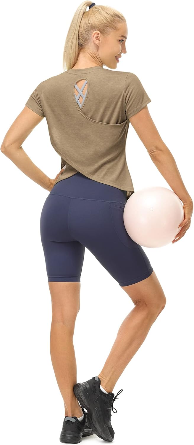 icyzone Short Sleeve Workout Tops for Women, Open Back Athletic Gym T Shirts, High Neck Running Yoga Tees