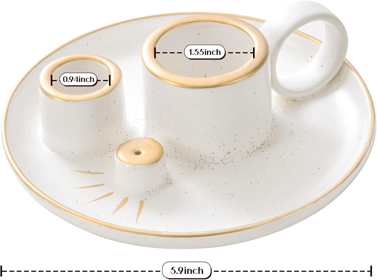 I really like this product and I was attracted to the fact that it holds incense, palo santo and sage. It has a wide base, so if you are burning incense it lands in the dish. I like the sage designated spot and the handle which is great to carry around if you like to smudge. The white and gold colors are very attractive and the dish comes with a very large set of tweezers and a brush fan, which I think it used to fan the coals. I really like the large tweezers because I use them to pull out the sage before it hits the gold paint, because I don’t want to ruin that feature. Overall, for about $22 this is a great dish if you like to smudge and burn incense. The smaller receptacle can take a taper candle, but I donât love taper candles so I wont use it for that. It is pretty and easy to clean and very easy to carry around. Great product.