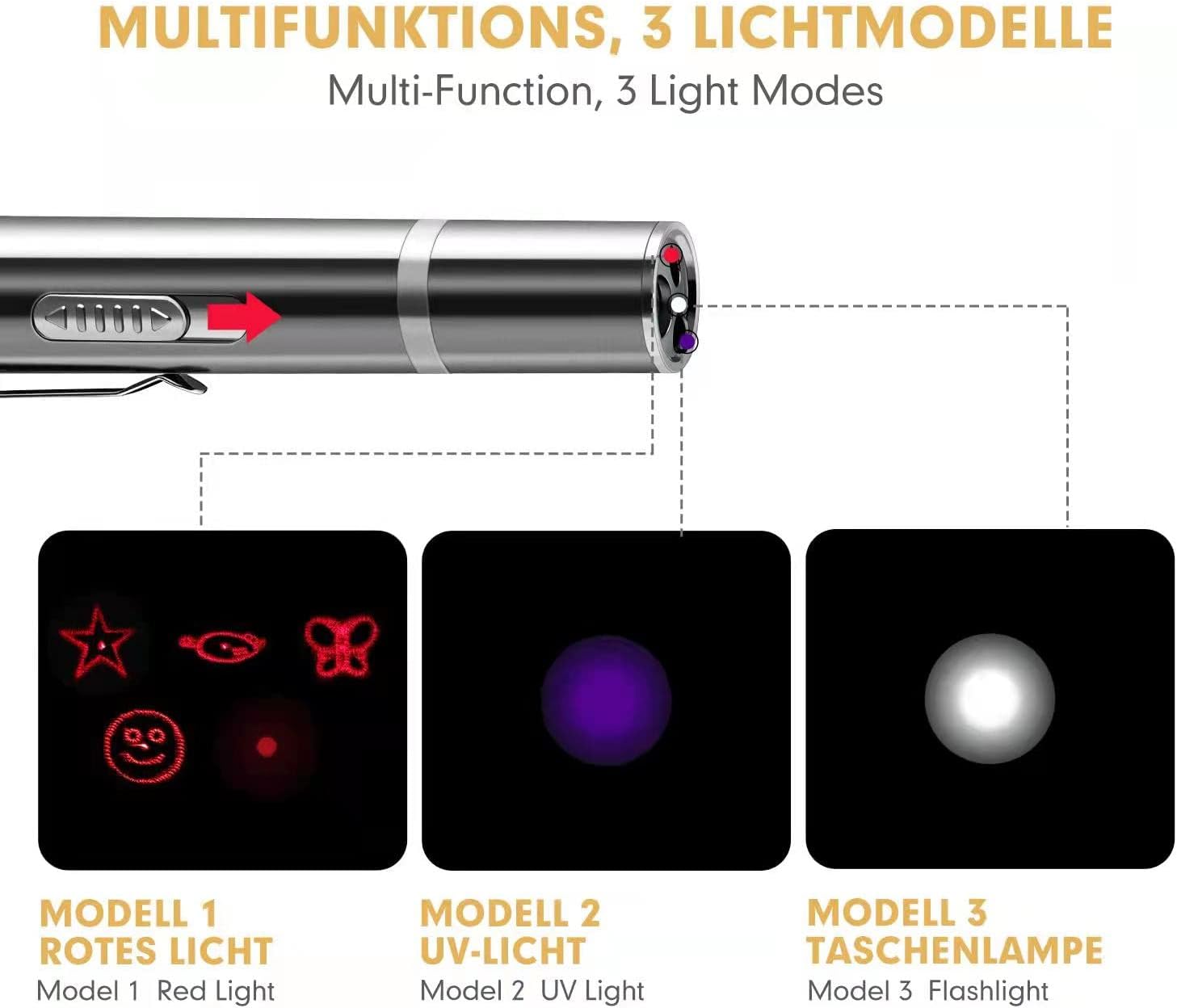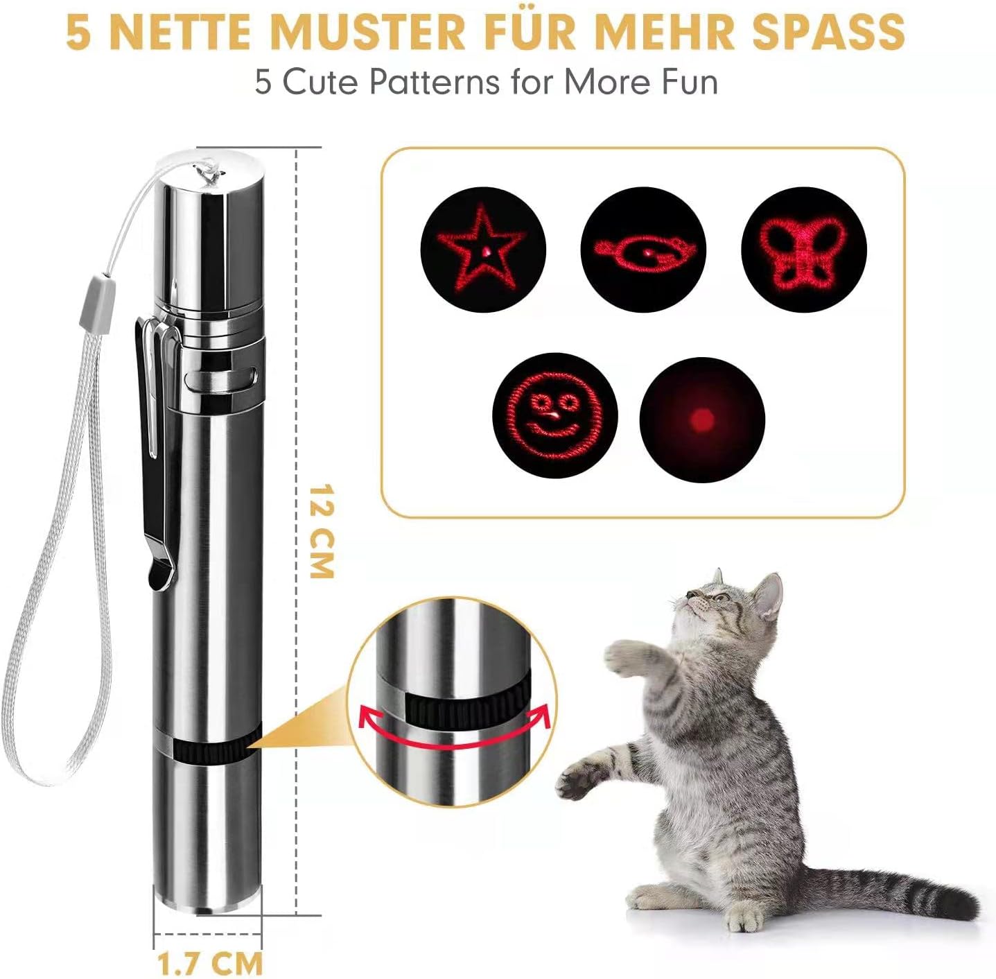 【7 In 1 Modes】This cat toys has 5 patterns: red dot, mice, butterfly, smile face, star. Scoll the black gear on the head to change to 3 different modes: red, purple, white. You can use the purple to check couterfeit currency and check your pets. White mode can be used for emergency lighting. The red mode can be used to play with your cat or for PowerPoint presentation.