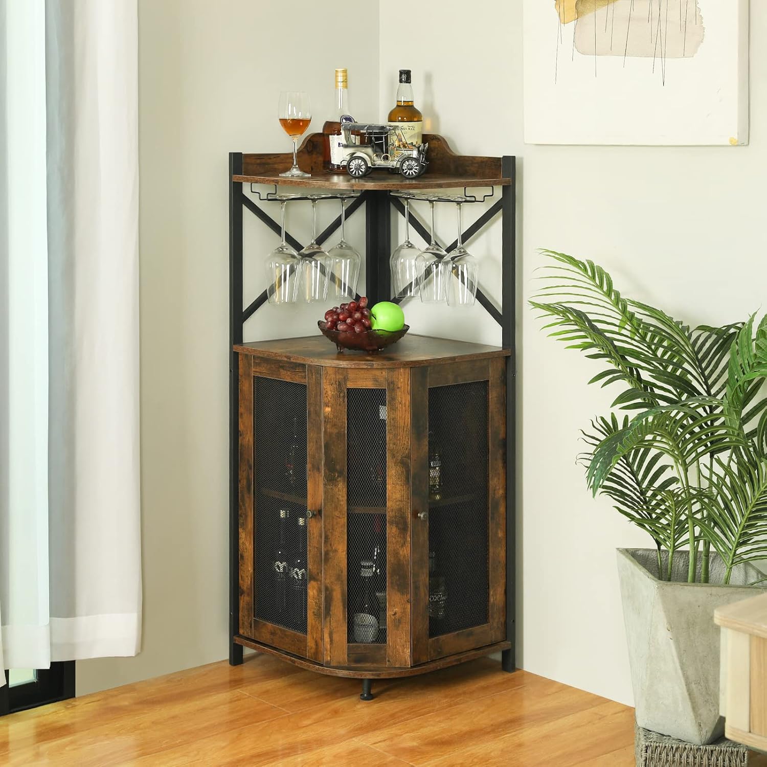 JKsmart Corner Bar Cabinet with Glass Holder, Industrial Wine Cabinet with Mesh Door, Liquor Bar Cabinet with Adjustable Shelf, Home Bar for Liquor and Wine Storage, Rustic Brown