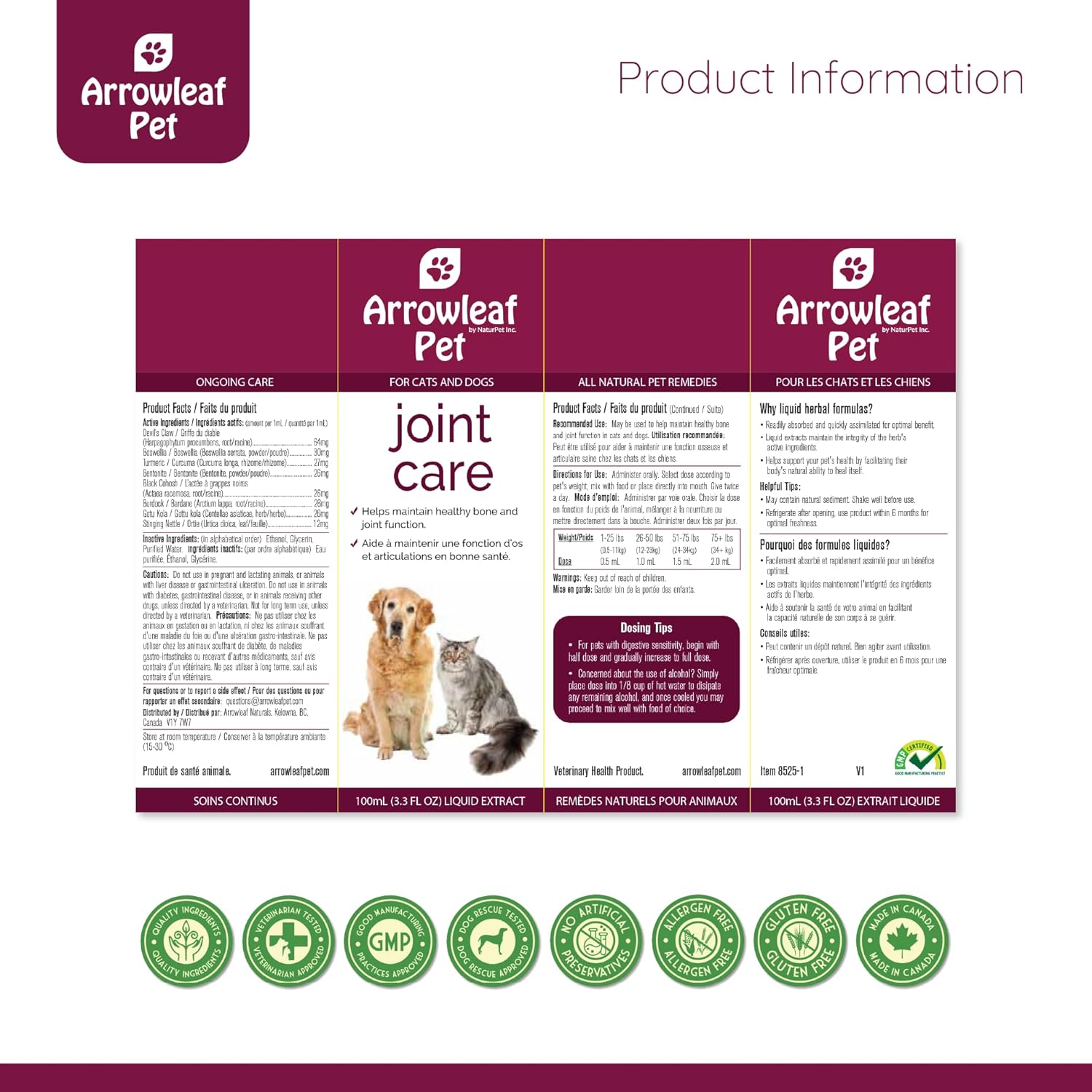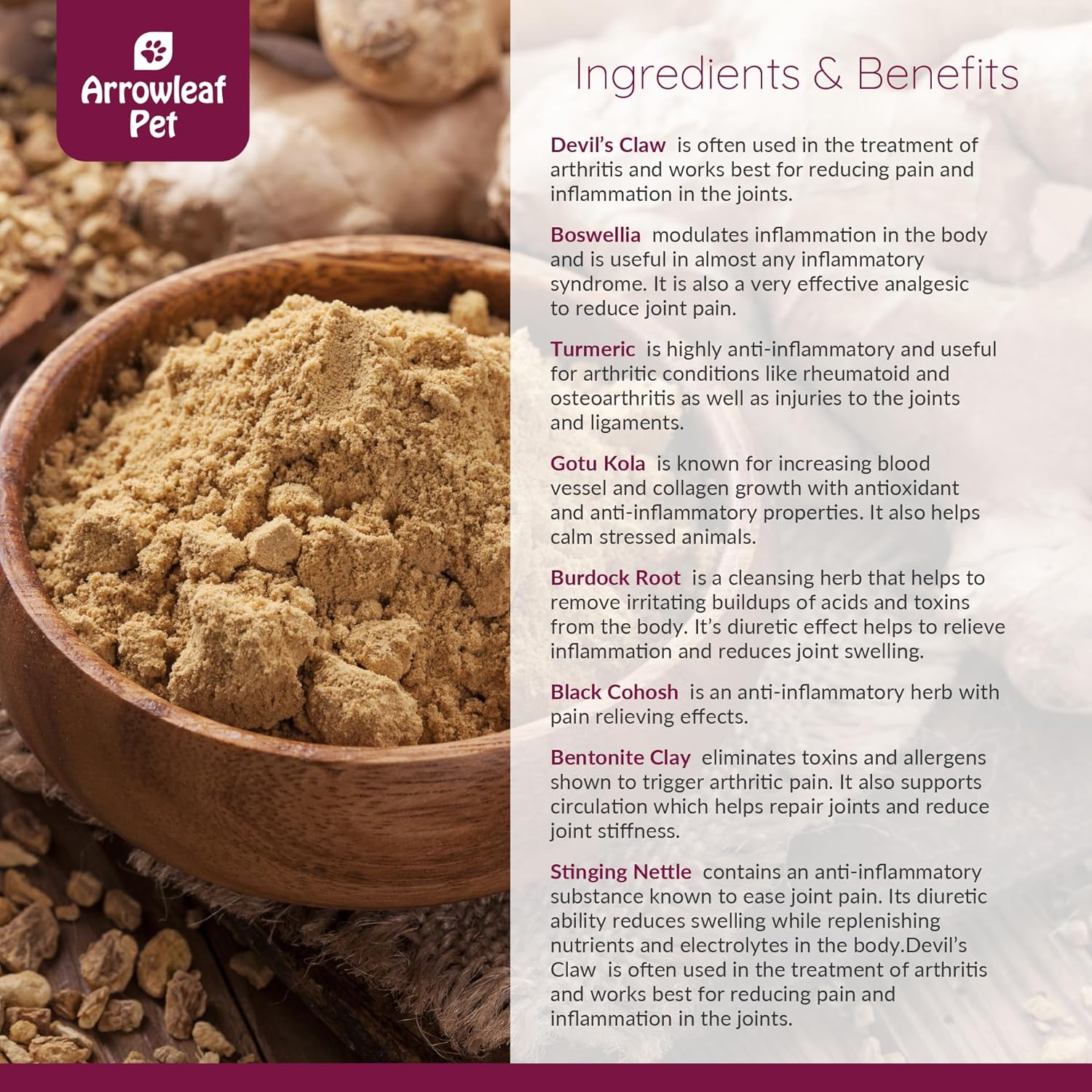 Arrowleaf Pet Joint Care harnesses the power of natural ingredients like Devils Claw and Turmeric, known for their support in joint health and mobility, providing a gentle yet effective approach to joint care.