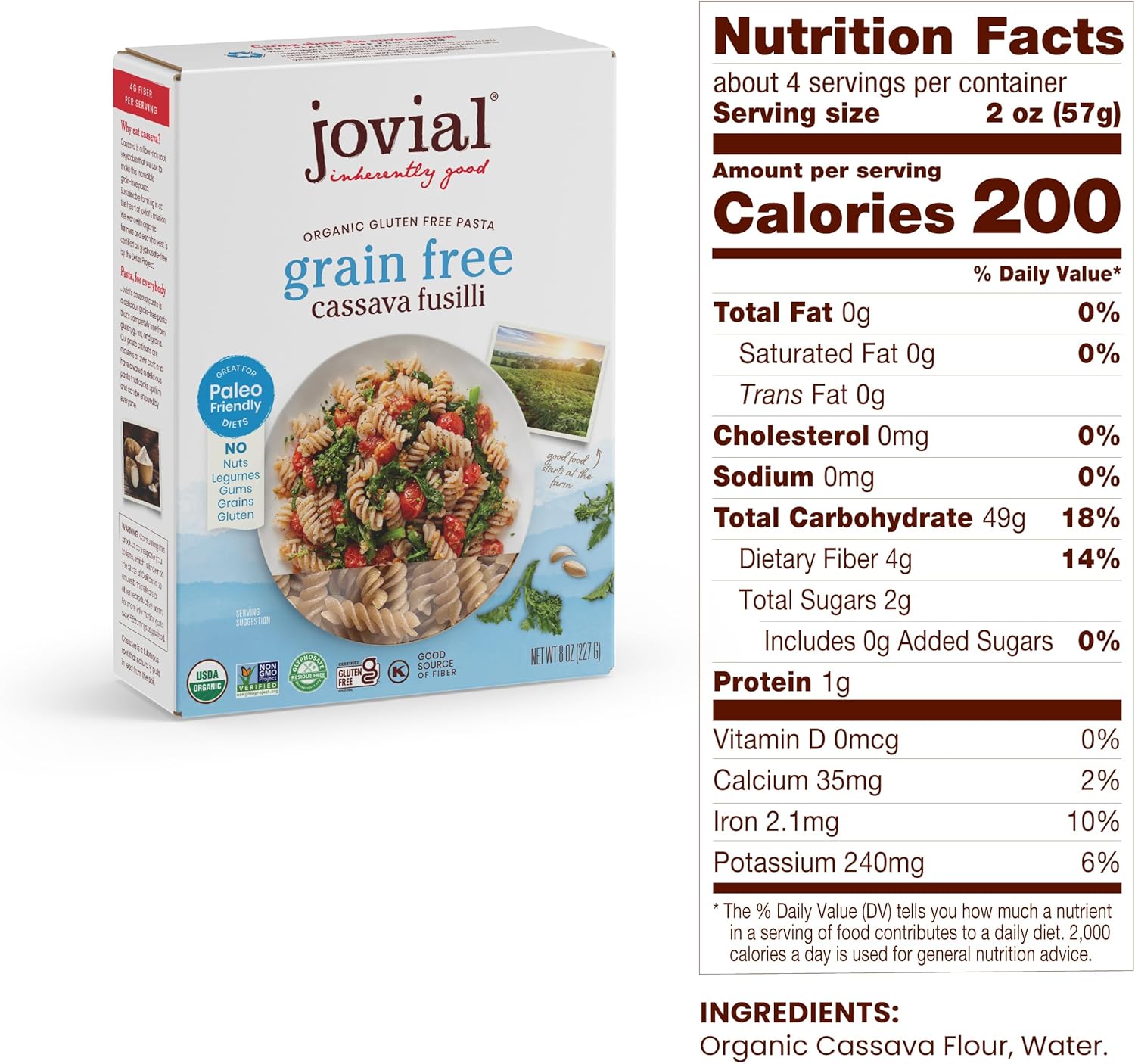 100% ORGANIC & NON-GMO PROJECT VERIFIED – Jovial Grain-Free Cassava Pasta is made with organic cassava flour & water. It is USDA Certified Organic, Non-GMO Project Verified, & tested for glyphosate