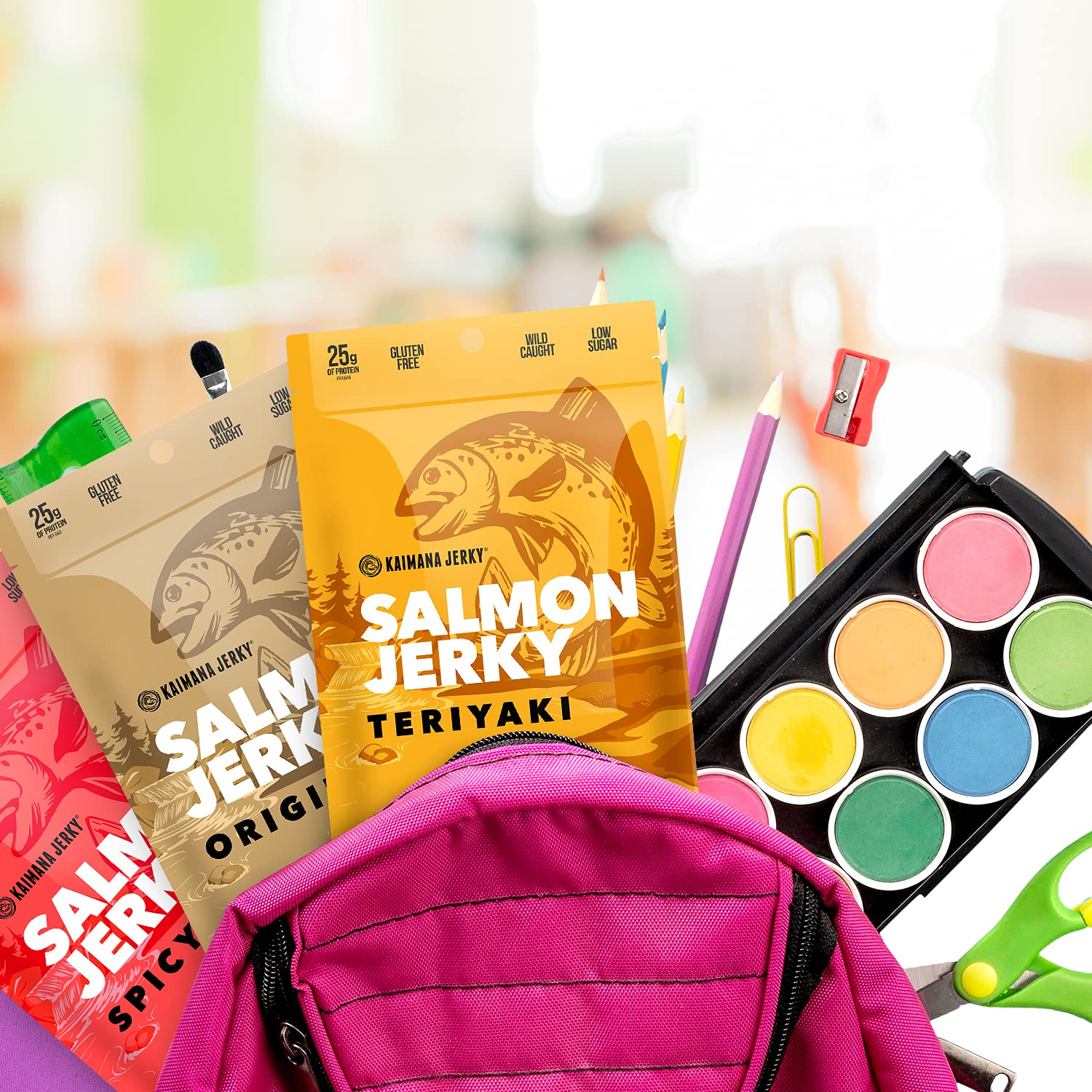 8 reviews for Kaimana Jerky Wild Caught Salmon Jerky – Organic Dried Fish Strips Rich in Omega-3, Protein – Low-Calorie Seafood Snack with No Gluten, Less Sodium & Sugar – Original, Teriyaki, Spicy Flavors – 3-Pack