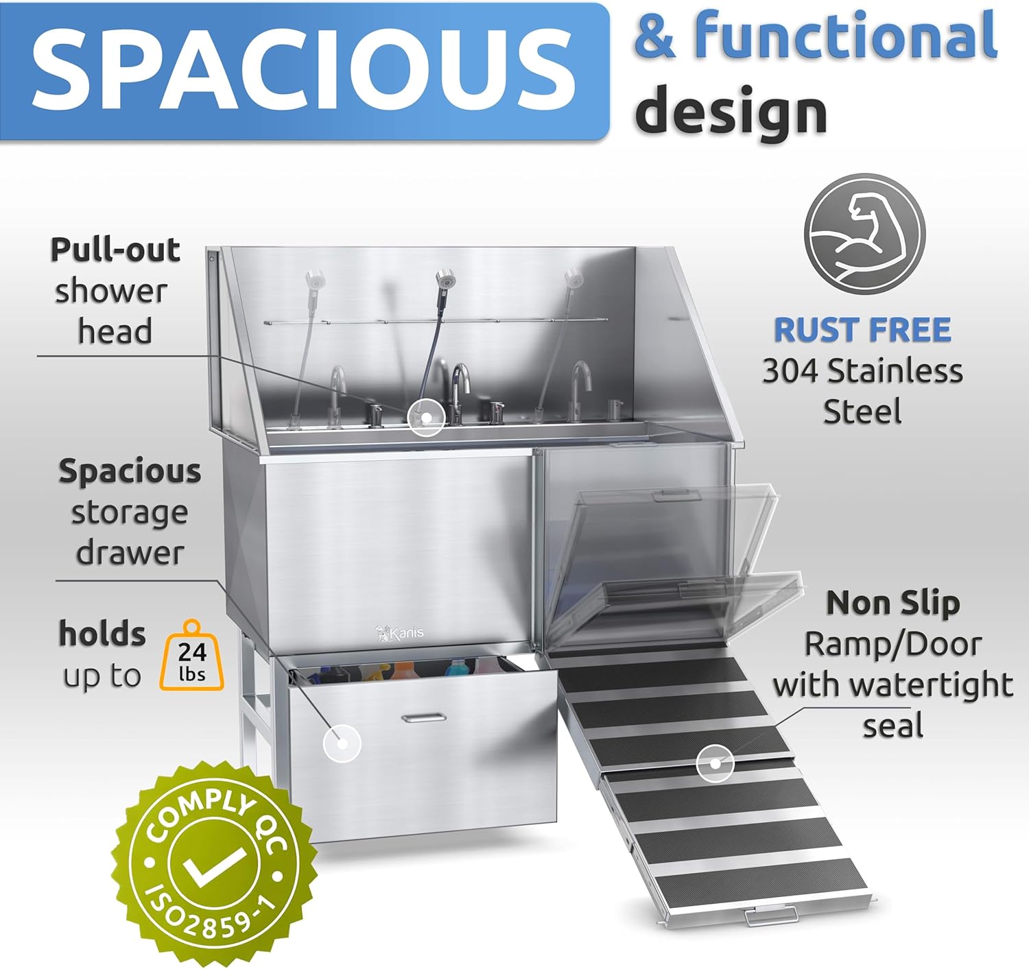 KANIS Professional Stainless Steel Dog Bathing Station – Dog Grooming Tub w/Ramp, Storage Drawer, Floor Grate & Faucet/Dog Bathtub for Large, Medium & Small Pets (50″, Right RAMP – 1 Drawer)