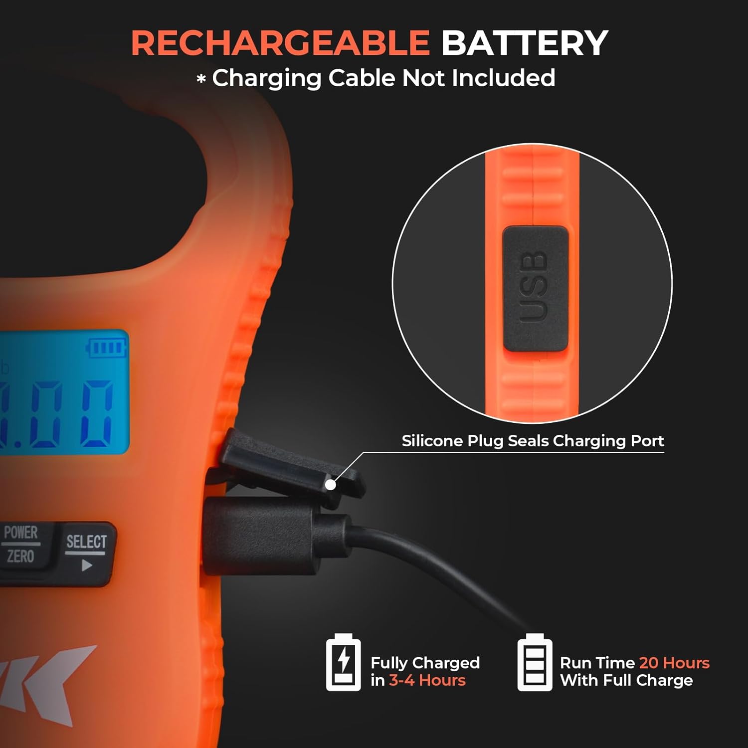 Rechargeable Battery – The ToughTide Scale features a sustainable rechargeable battery with USB-C port, offering up to 20 hours of continuous usage on a single charge, with a quick 3-4 hour recharge time.(Charging cable not included)