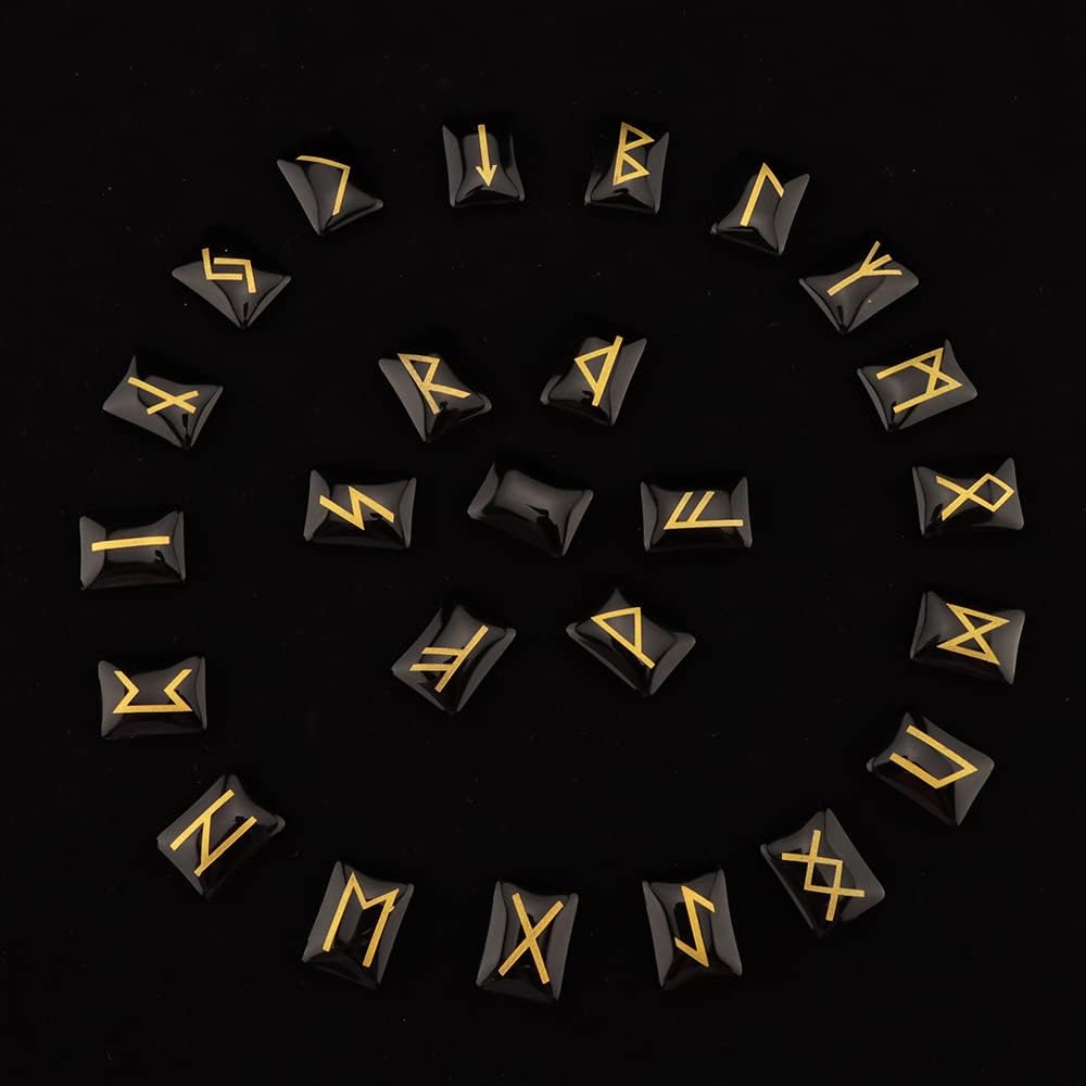 Runes include: 25pcs bright black square rune , including 24pcs gold lettering and one blank.