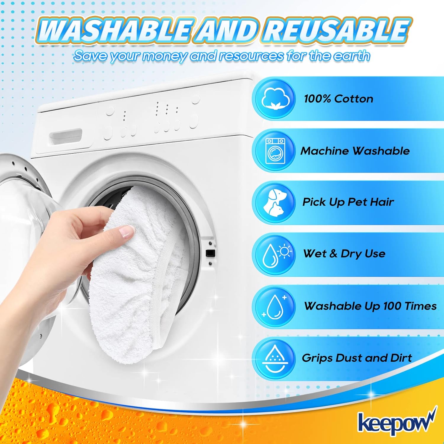 Machine Washable and reusable No money wasted on disposable refills. Save money and environment !