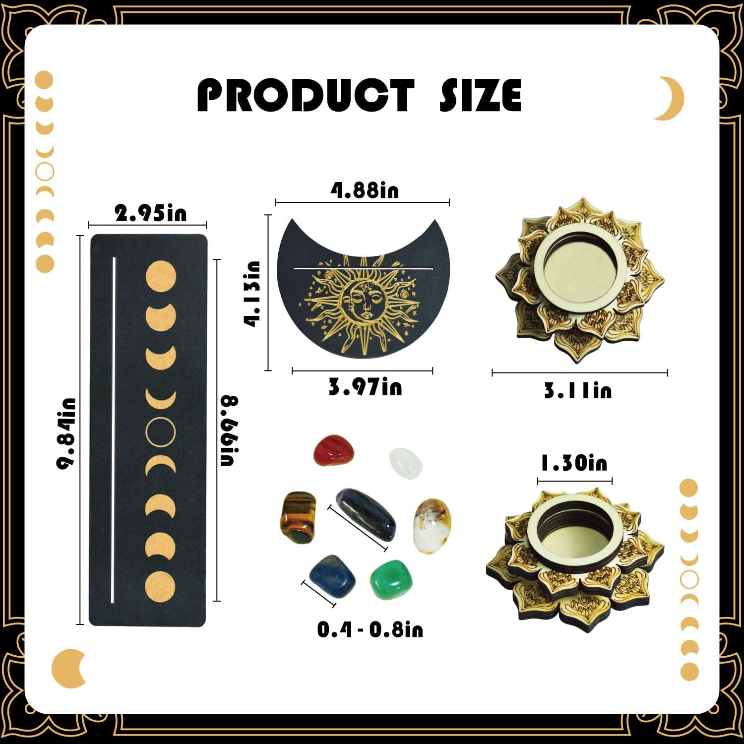 You will get 10-piece set includes a black card holder, a moon shaped card holder, a crystal ball base and 7 tarot crystals.Rectangle shape the dimensions are 9.8 in * 2.95 in * 0.2 in .Moon shape the dimensions are 4.88 in * 4.13 in * 0.2 in .Sphere wood holder stand he dimensions are 3.11in * 3.11in.Please note that since tarot crystal stones are natural, sizes may vary.