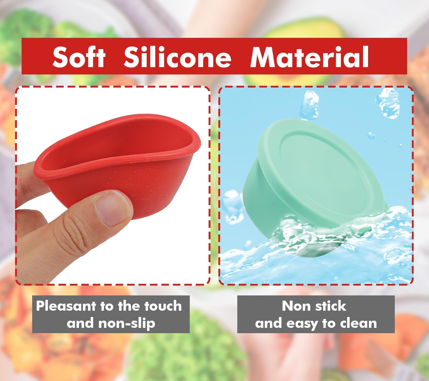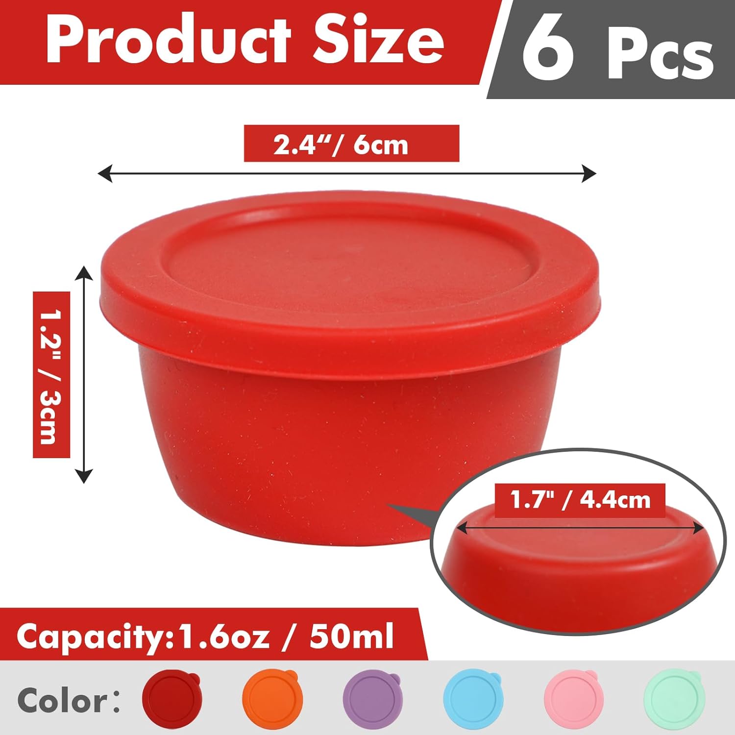 Product Detail Material: 100% Food Grade Silicone Package: 6 Pieces Color: Red, Blue, Green, Purple,Pink,Orange Capacity: 1.6OZ (Each Container) Size:2.4″D x 1.2″H ((Each Container)