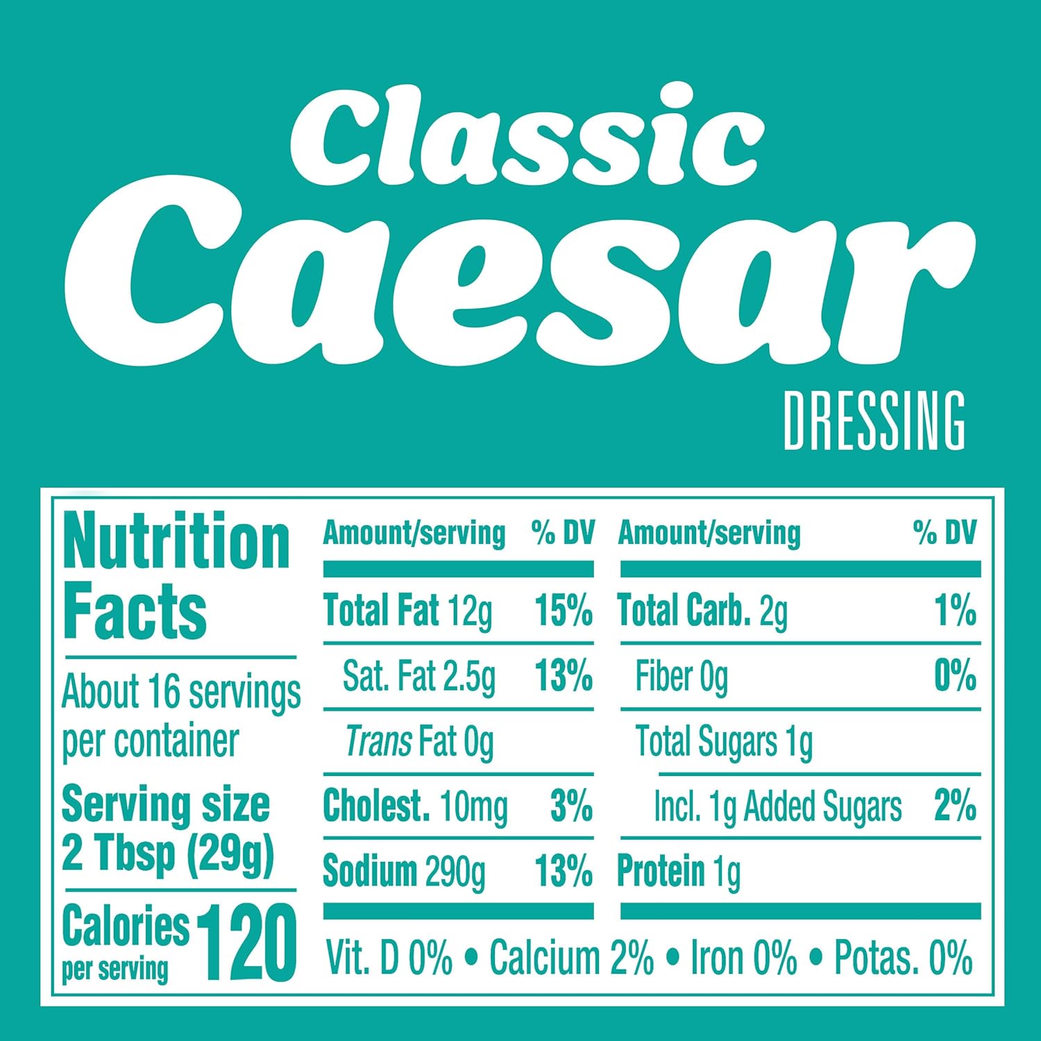 Kraft Classic Caesar Dressing has a savory flavor that your family trusts and loves. Our pre-mixed dressing arrives ready for use with a quick shake. Made with premium-quality ingredients, our classic Caesar dressing lets you make the perfect salad. There are no artificial colors or flavors, and each serving has 120 calories. Made from a tangy blend of oil, vinegar, dried garlic and Parmesan and Romano cheese, our creamy dressing leaves your mouth bursting with flavor. Use Kraft’s specially blended Caesar dressing to prepare saucy chicken Italiano for dinner, or enjoy a decadent and creamy Caesar salad. All you need is the lettuce and croutons and you’ve got the perfect side for your weeknight meals. Our 16 fluid ounce bottle of Caesar dressing has a clear exterior, so you’re able to easily monitor how much dressing remains. Each squeezable dressing bottle comes with a convenient applicator top so you can add the perfect amount to all your favorite dishes.