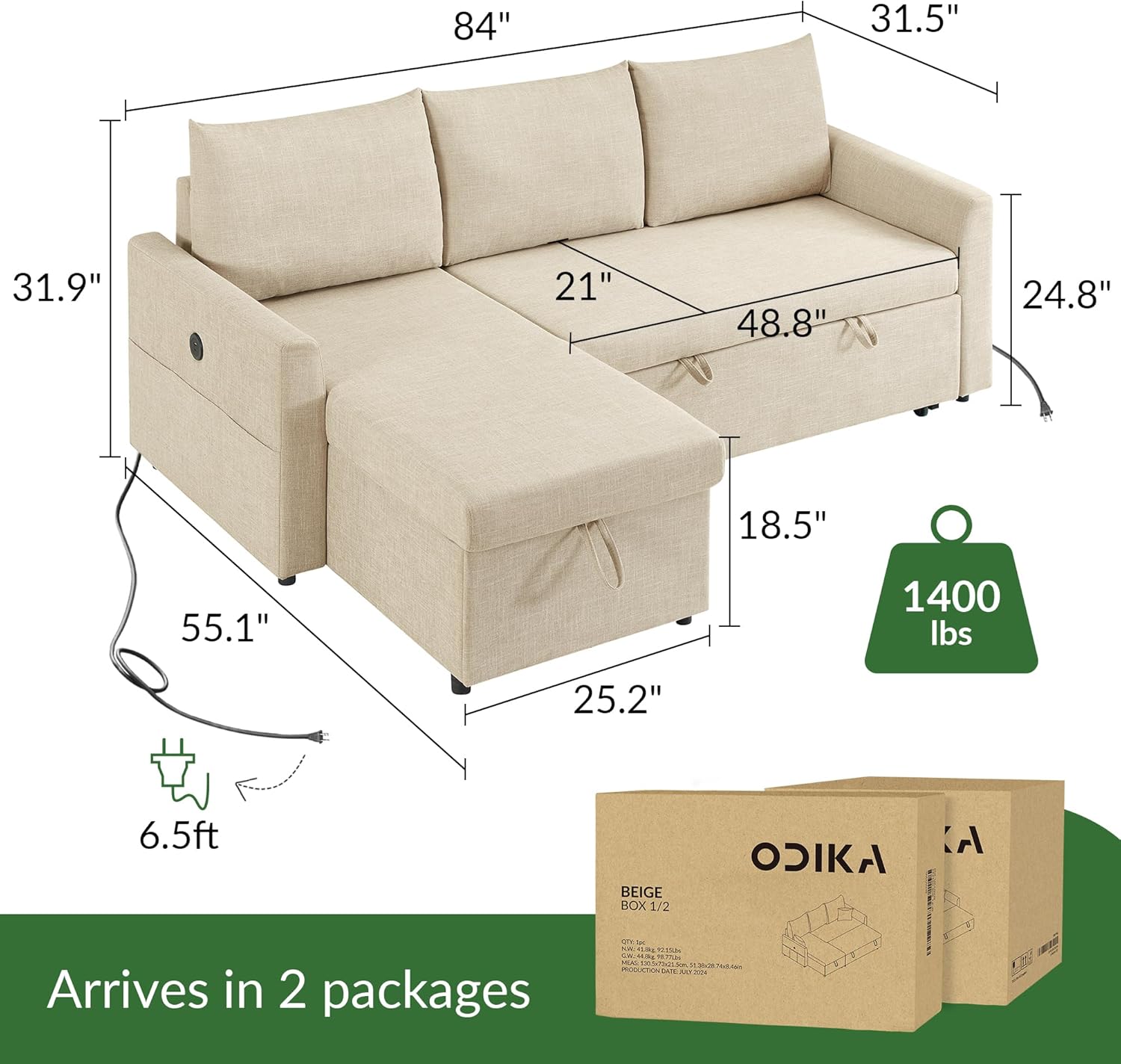 L Shaped Convertible Sleeper Sofa Bed, 84″ Sectional Couch for Living Room – Dual USB-C Charging, Pull Out Bed, Reversible Chaise with Storage & Pockets, Removable & Washable Beige Linen Covers