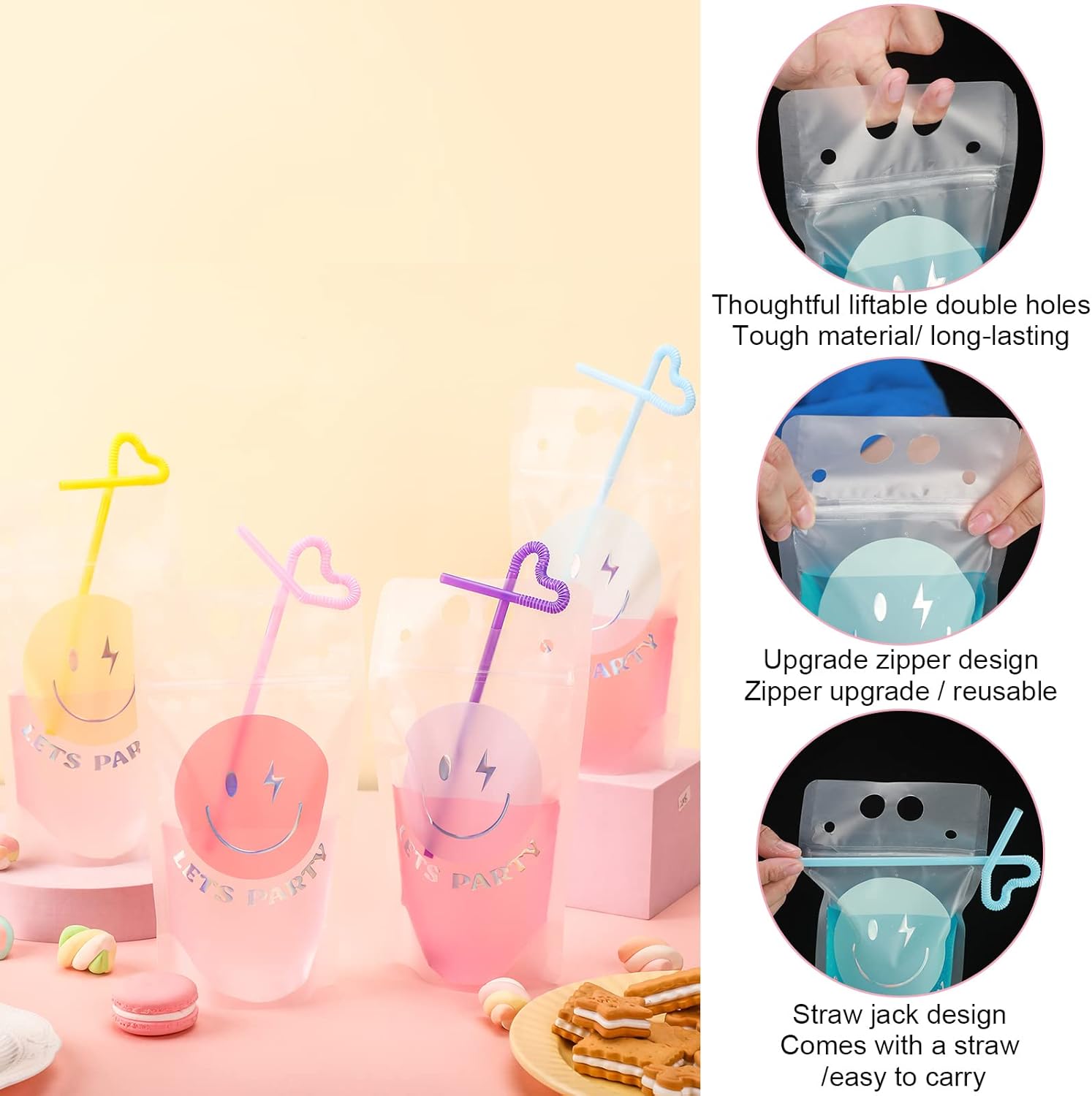 Lallisa 36 Sets Pastel Smile Drink Pouches with Straws for Adults Plastic Drink Bags with Zipper Bachelorette Beverage Bags Juice Pouches for Party Supply