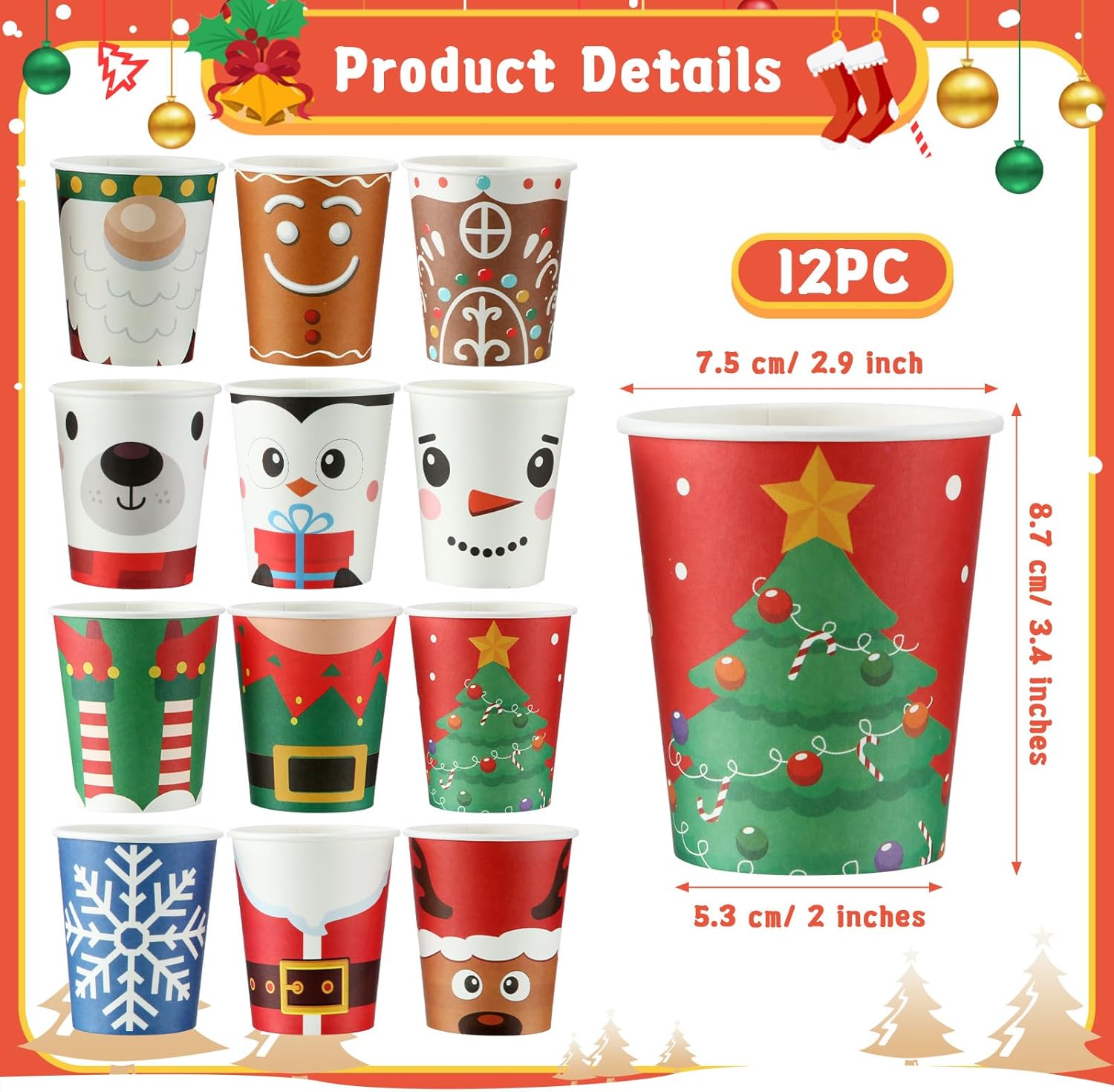 Layhit 120 Pcs Christmas Paper Cups 9 OZ Disposable Christmas Coffee Cups Santa Elf Snowman Elk Cold Hot Drink Cups for Daily Use Xmas Holiday Drinking Cocoa Tea Beverages Party, 12 Styles