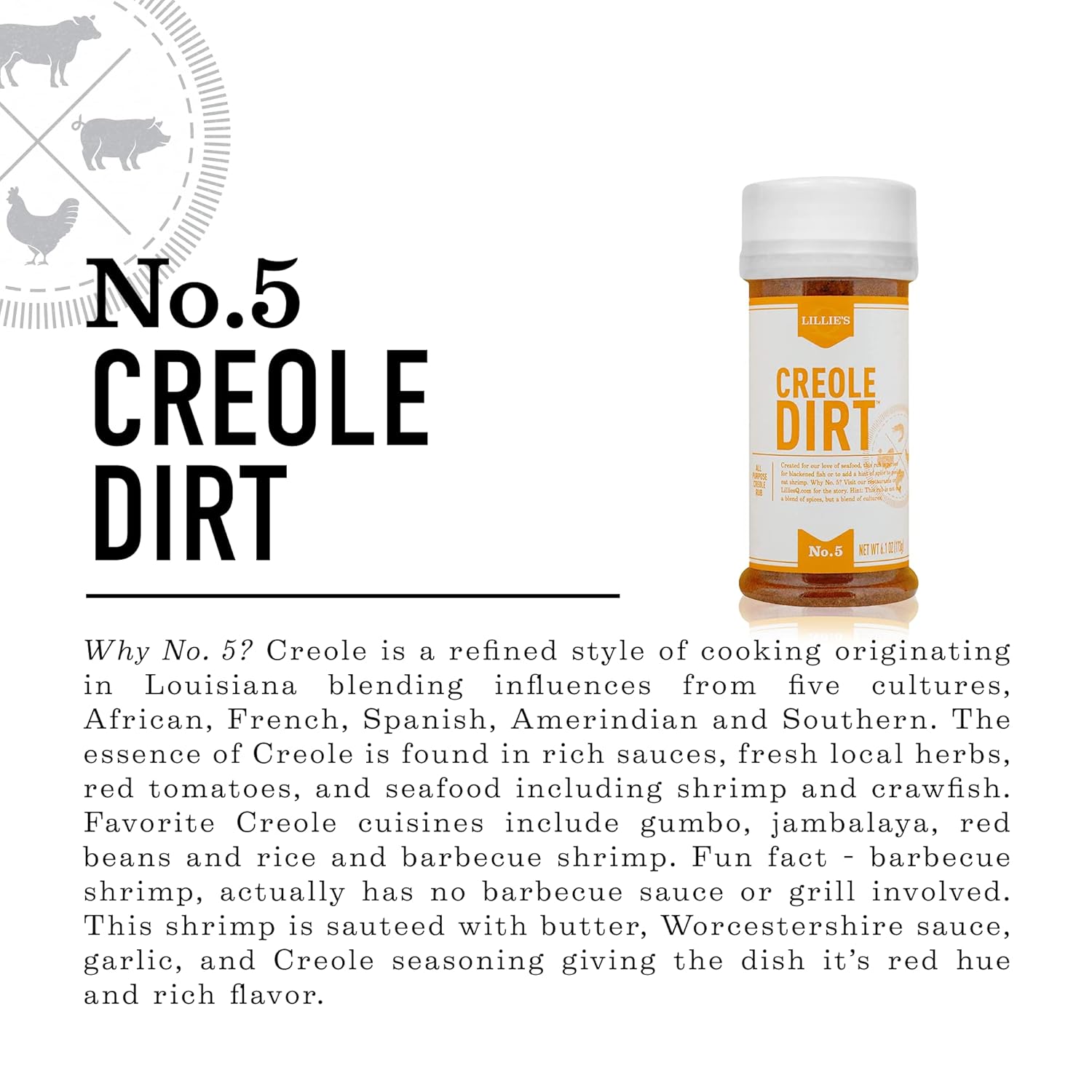 A MULTI-CULTURAL TRADITION: Why No. 5? Our unique Creole blend is a combination of five cultural influences & flavors: African, French, Spanish, Amerindian, & Southern. Combining these flavors adds to the versatility of this Louisiana-born seasoning.