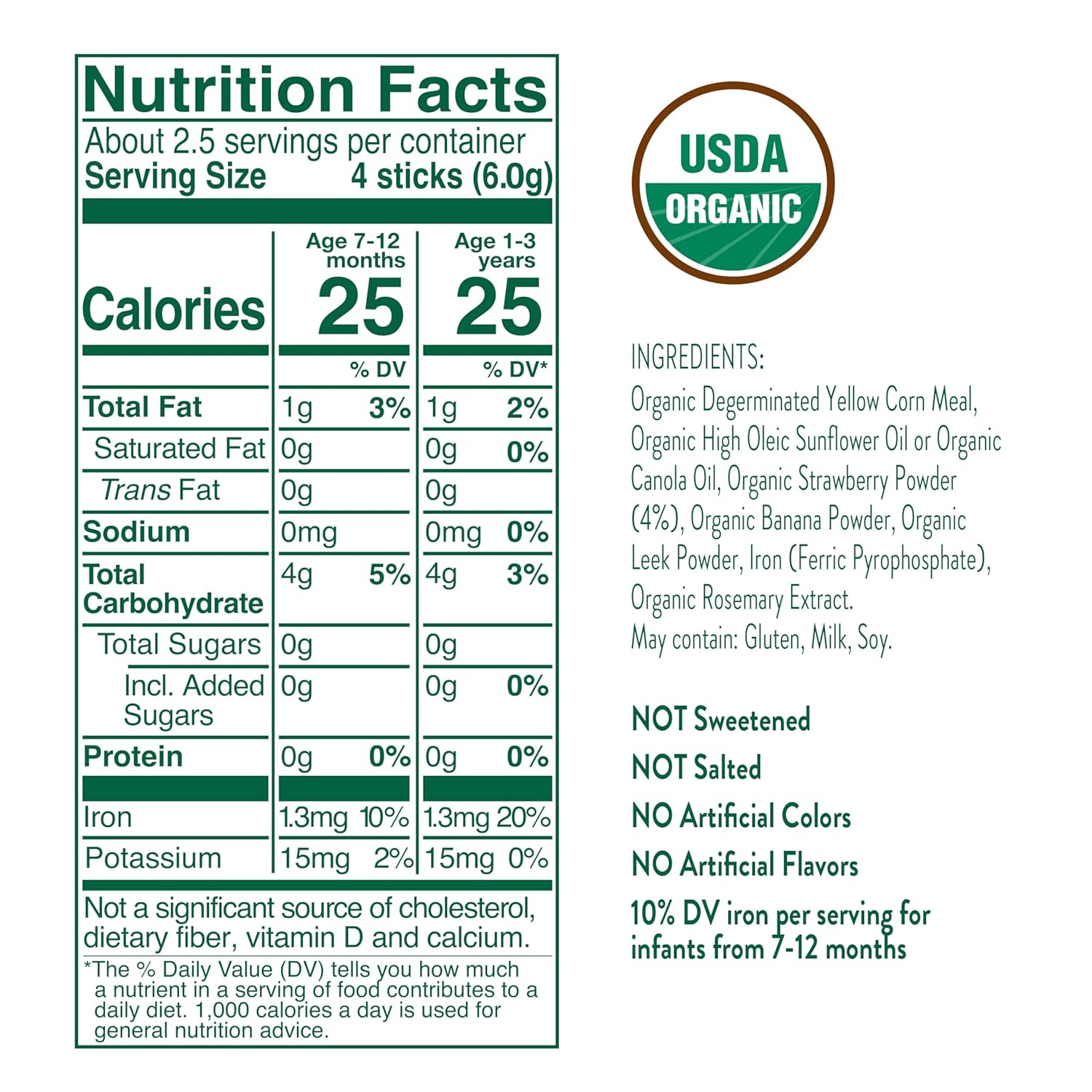 Soft melt-in-the-mouth sticks of puffed organic corn sprinkled with strawberry that little hands can hold and mini mouths devour. Perfect for safe self-feeding. Or licking. Or smooshing.