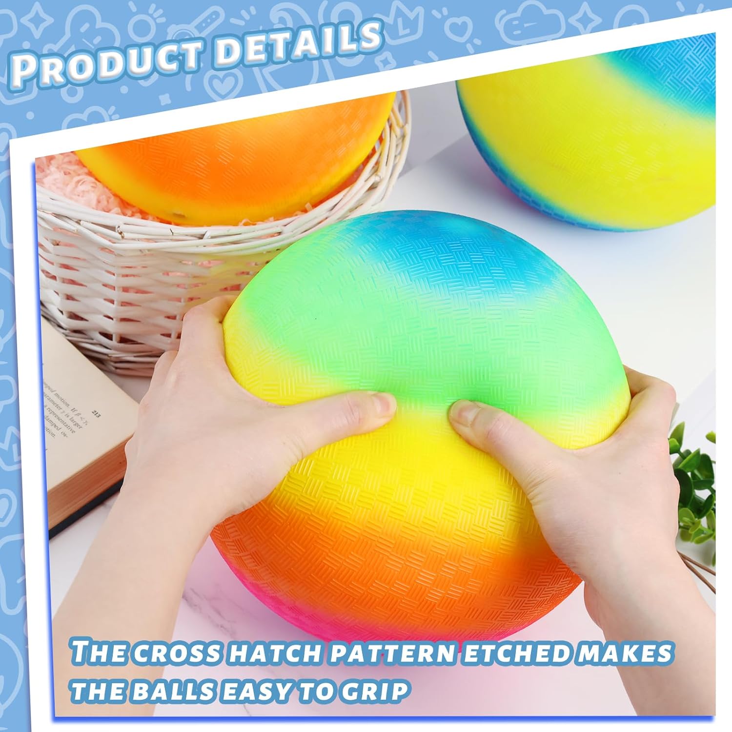 Package Include: The ball set includes 4PCS rainbow playground ball and 1PC air pump (Placed inside of the handle of pump ). The ball has an 8.5inch diameter (after inflating), featuring textured no-slip grip, bright and vibrant.