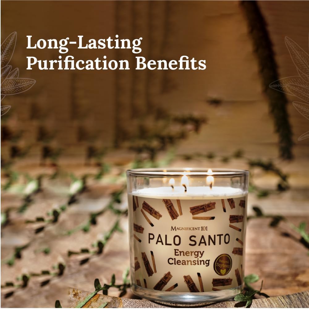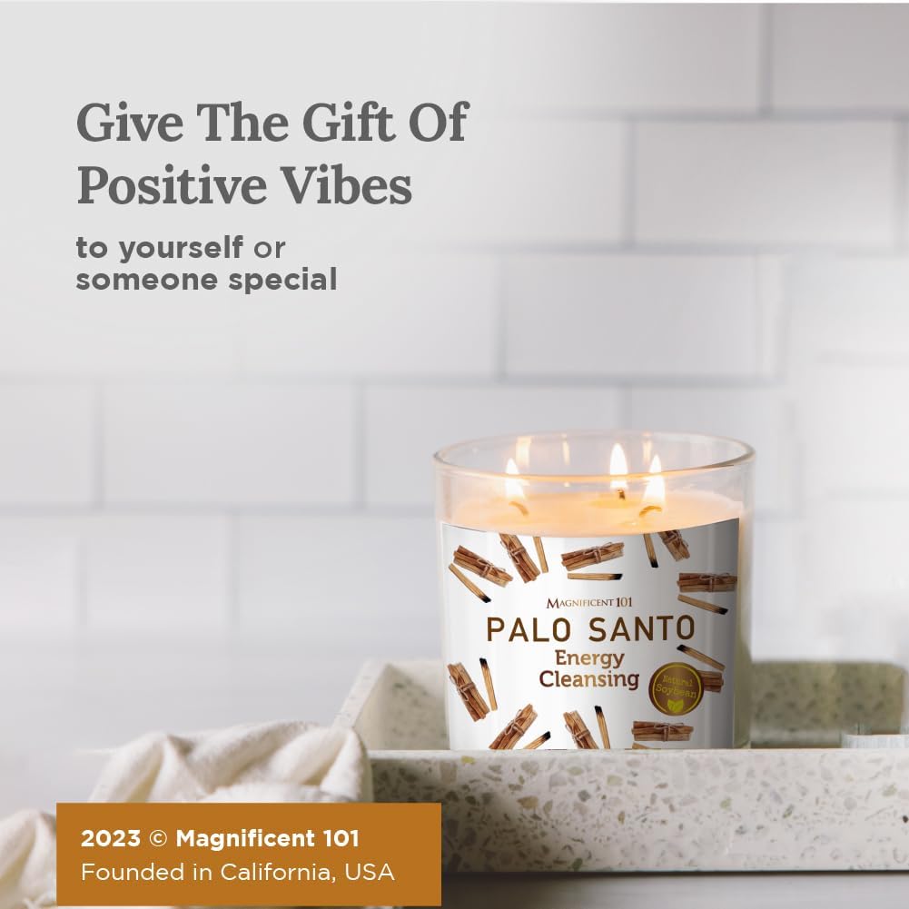 Magnificent 101 Long Lasting Palo Santo Scented Aromatherapy Candle | 14 Oz – 56 Hour Burn | All Natural & Organic Soy Wax Smudge Candle for House Energy Cleansing, Purification & Manifestation