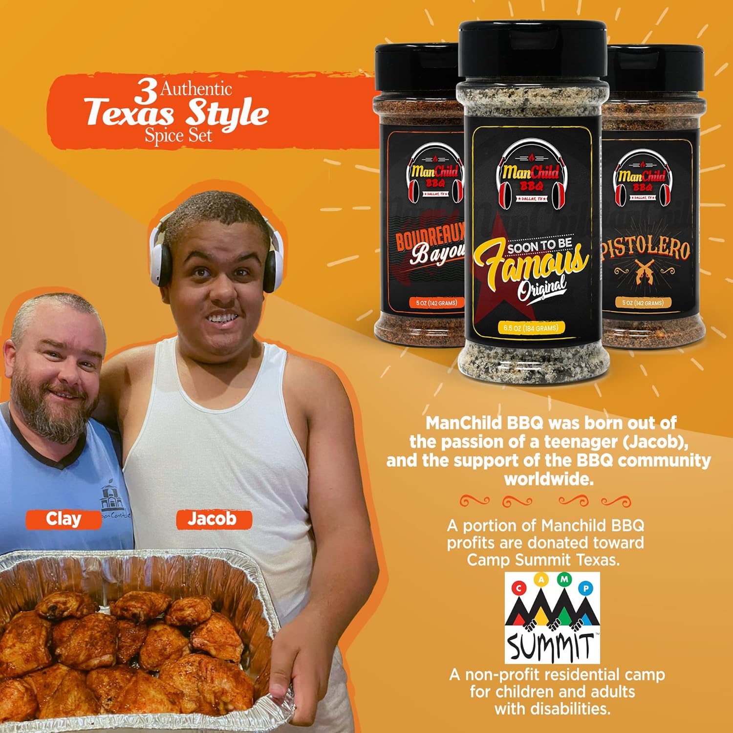 Help a Cause: A portion of Manchild BBQ profits are donated on Camp Summit Texas, a non-profit residential camp near the Dallas/Fort Worth Metroplex that offers children and adults with disabilities an opportunity to enjoy the sleepaway camp experience