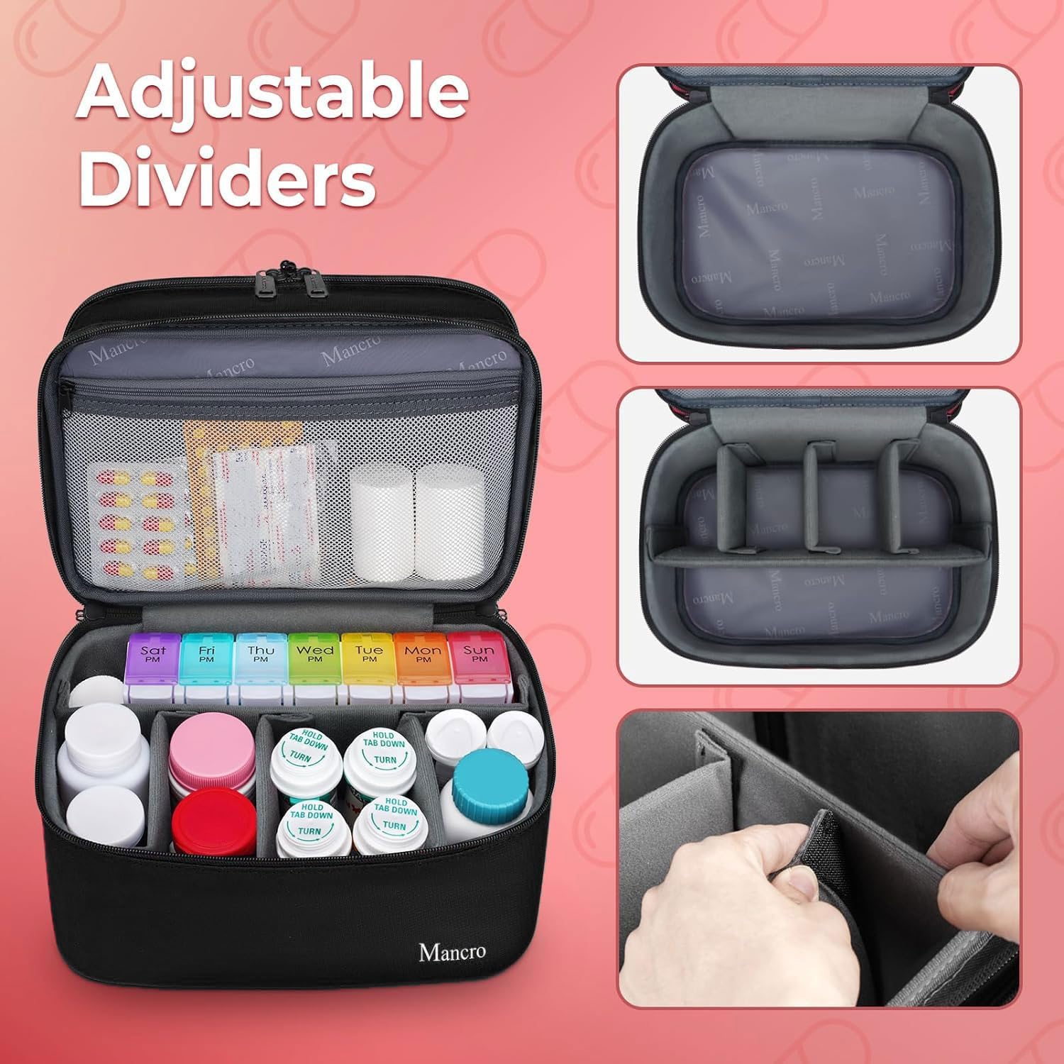 Large Capacity: Mancro medicine organizer bag offers ample space to classify and organize personal pill bottles, medicines, Vitamins, weekly pill organizer, emergency medication, and other medical supplies. Compact sizes allow the medication bag to fit well in cars, trunks, backpacks, or luggage for vacations, Only Empty Bag