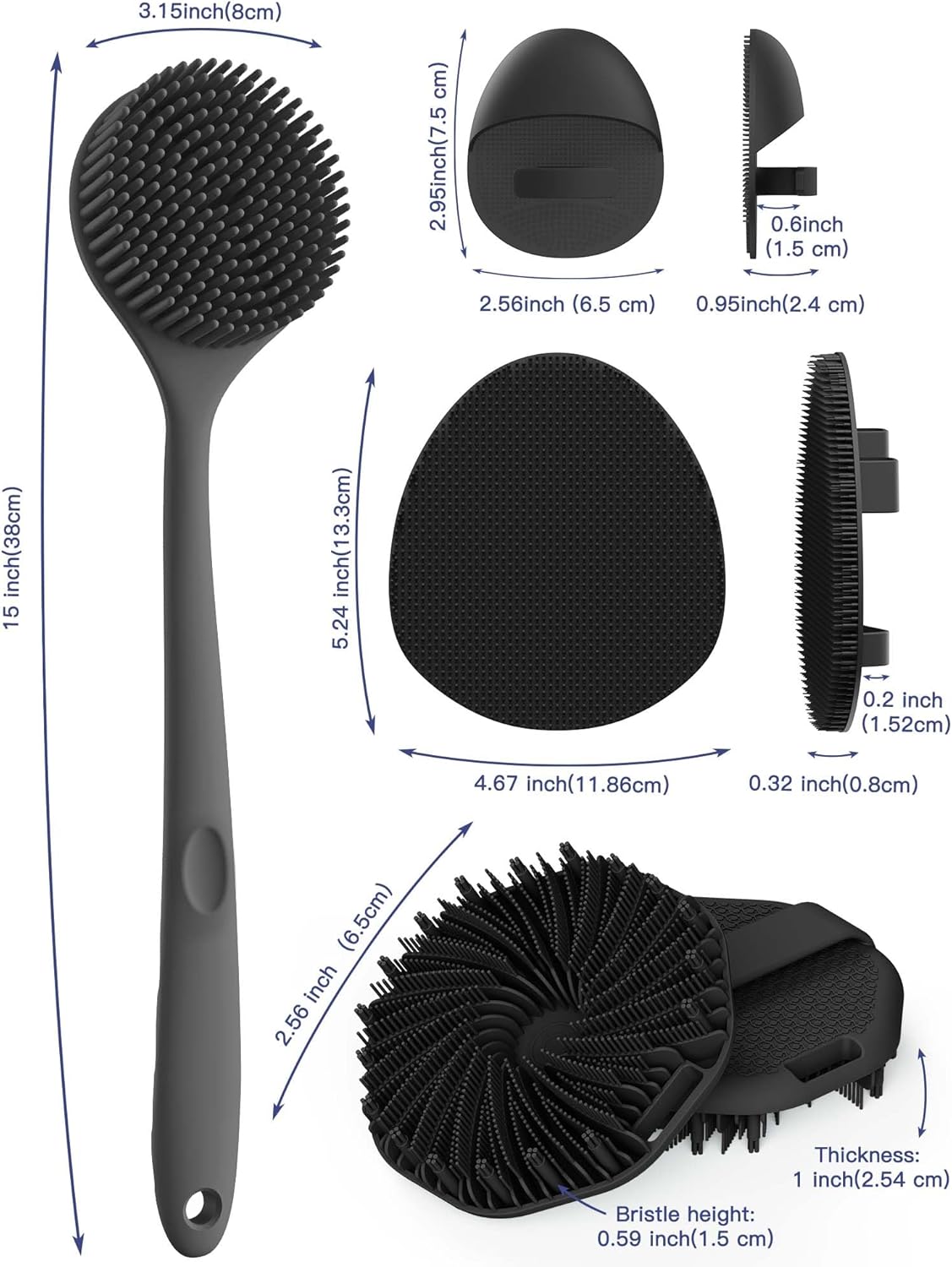 【Easy-to-clean & Hygienic】 Silicone material is easy to clean, quick-drying and not easy to produce bacteria. You just need to rinse it and hang to dry. Package includes: back brush x 1; soft brush x 1; face brush x 1; body buffer x 1; strong adhesive hook x 2.