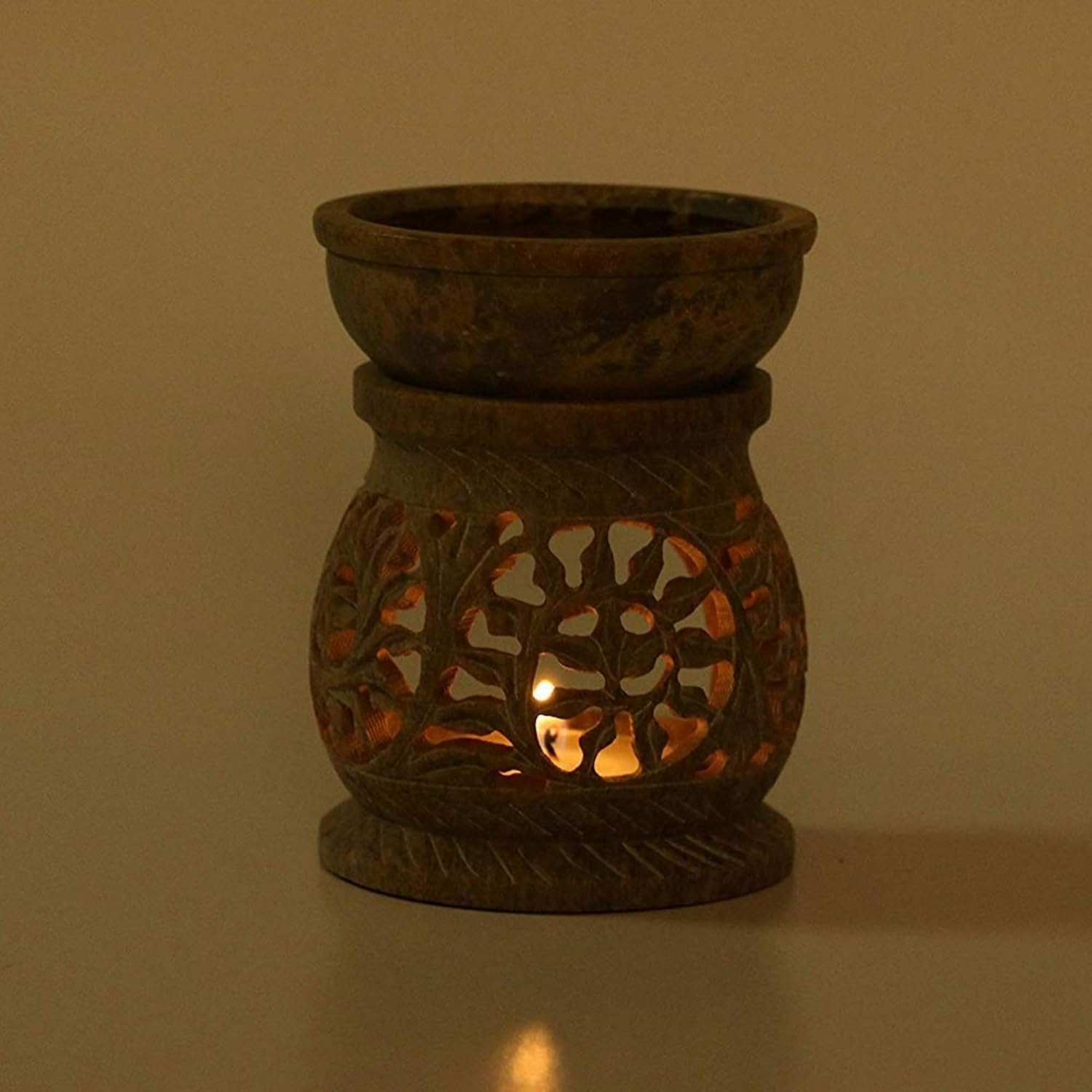 Aromatherapy Artisan Hand carved Stone Oil Diffuser Burner with Tea Light Holder. Hand carved from soapstone by the artisans of rural India. This diffuser is delicately carved from Soapstone. Unique with a natural variation in colour of the stone, Our artisans work tirelessly to bring to you perfectly carved pieces. All our products are sourced from traditional artisans from Indian villages who have been using time tested techniques in the handcrafting and this is our small effort to provide some highly needed support to these traditional arts and crafts that are facing a daily struggle to survive in todays world.