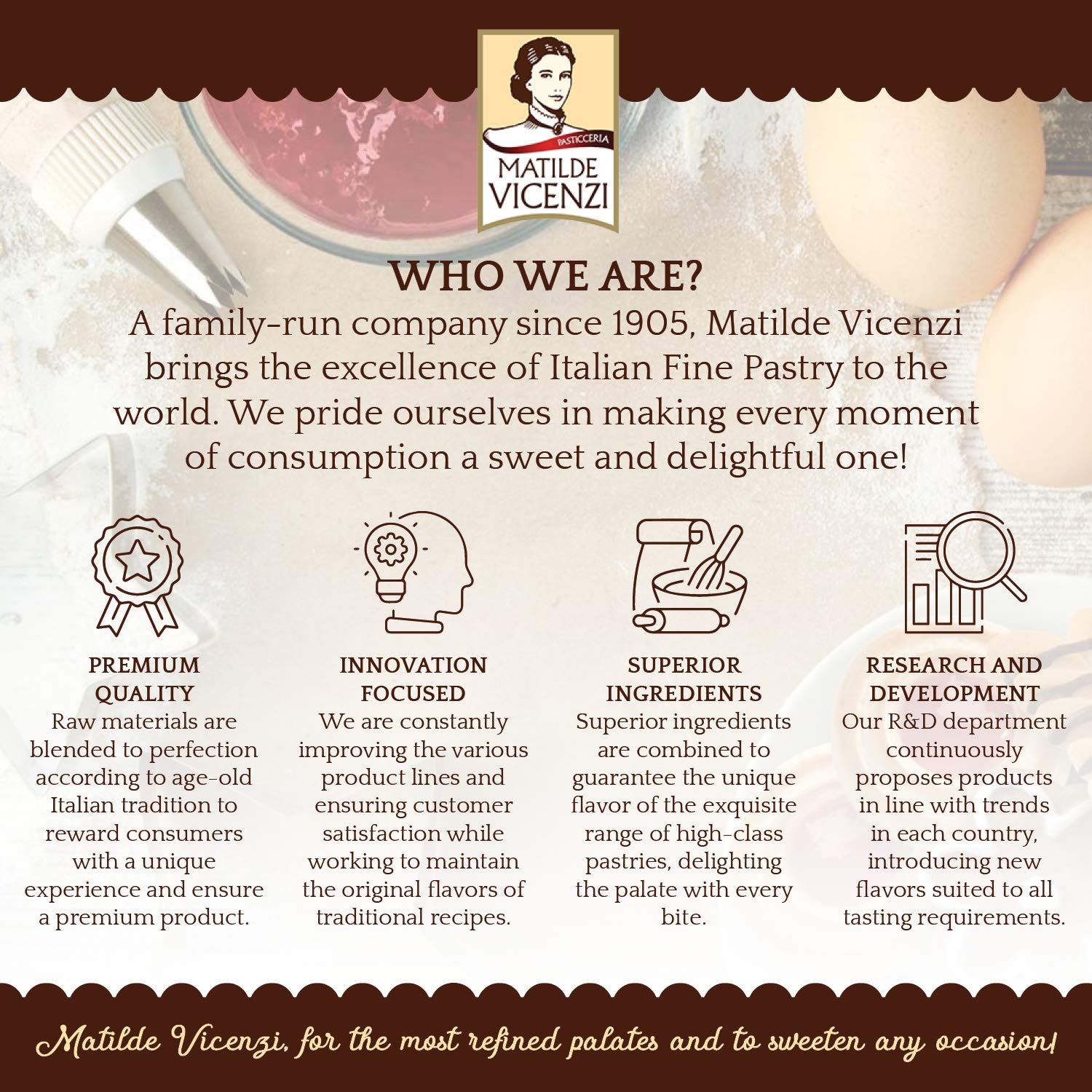 A Heritage of Excellence – A family-run company since 1905, Matilde Vicenzi brings the finest Italian pastry to the world, upholding the original flavors of traditional recipes while embracing innovation in the art of confectionery. No preservatives, artificial colors, or hydrogenated fats – just pure indulgence.