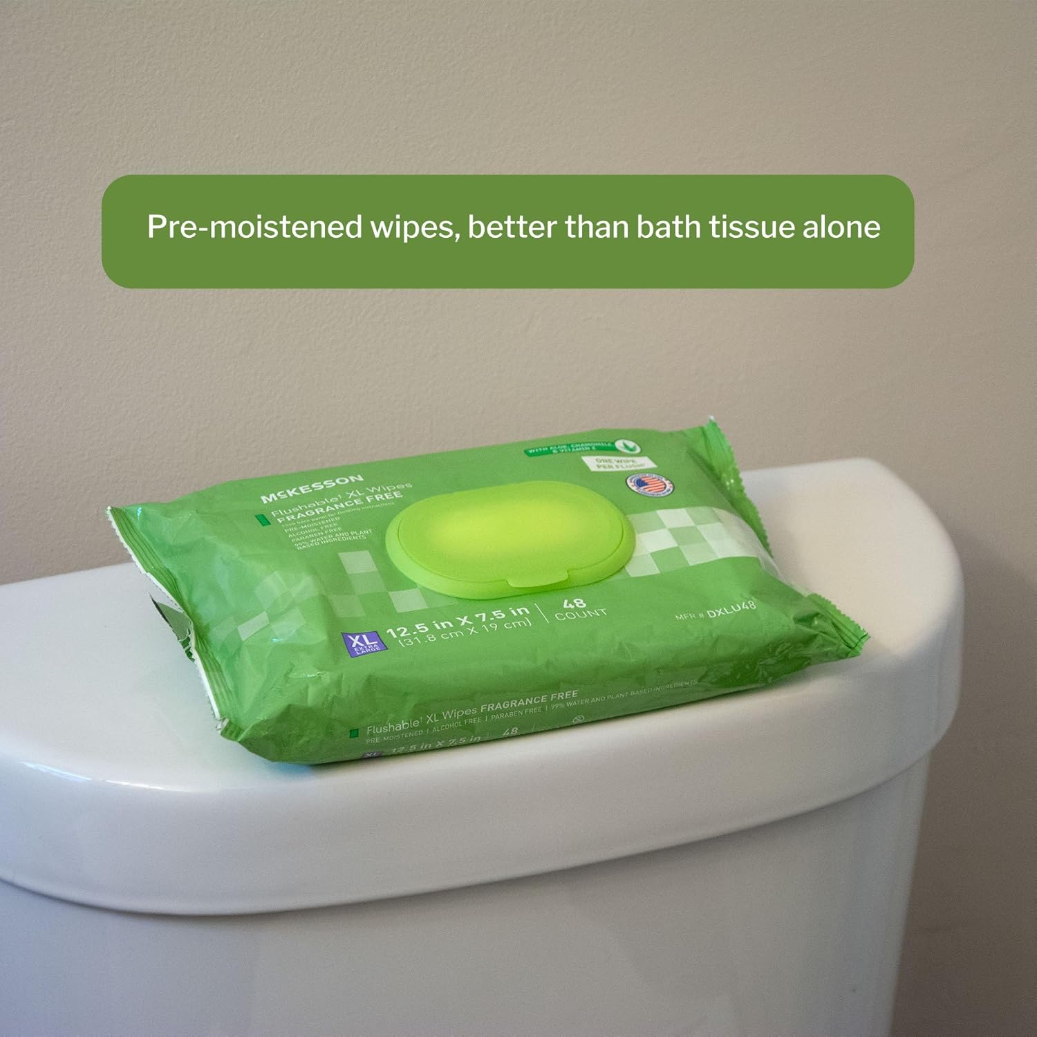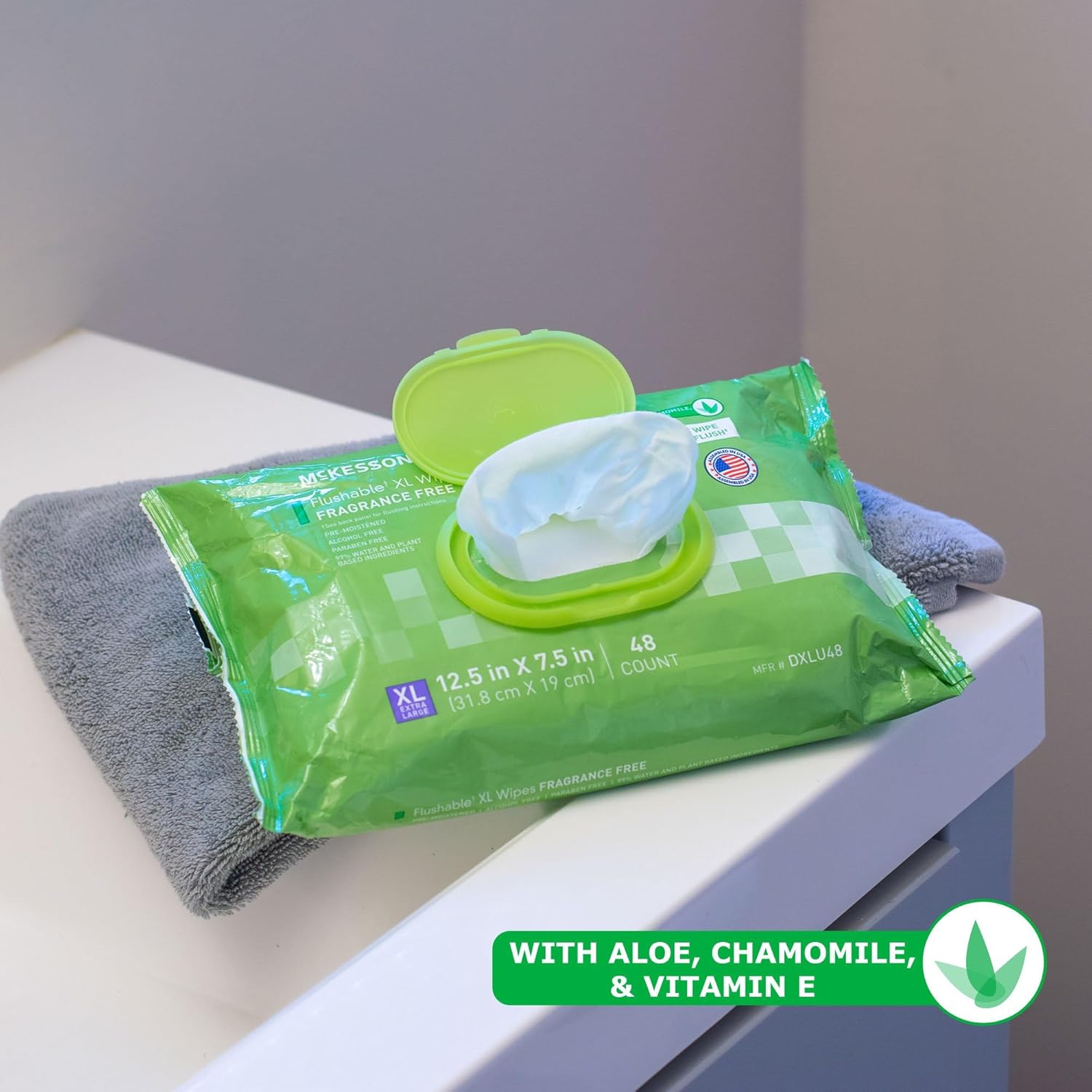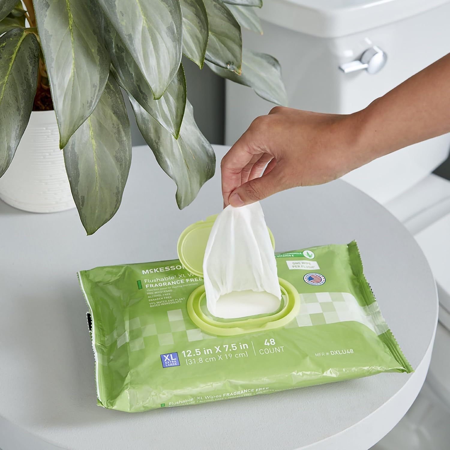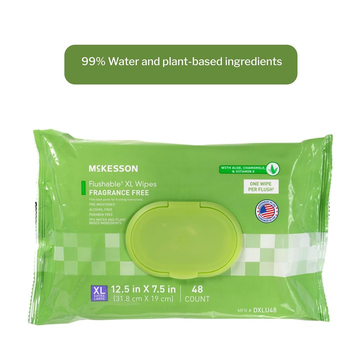McKesson Flushable* Wet Wipes XL – Aloe & Vitamin E Formula, Gentle on Skin, Plant-Based Adult Cleansing Wipes – Unscented, 48 Wet Wipes per Pack, 48 Wipes, 1 Packðï¸ Quick Rec:These wipes are a good purchase, offering great value and practicality for various cleaning tasks.ð Additional Notes:I’ve been pleasantly surprised by the versatility of these wipes. While I initially got them for the baby, I’ve found myself reaching for them for all sorts of cleaning needs around the house and in the car. The generous size is a major plus, and the lack of scent is appreciated.â Pros â - Generous size, perfect for larger areas or tasks- Unscented, suitable for sensitive individuals- Flushable, convenient disposal- Durable and moist, effective cleaning- Plant-based, eco-friendly optionâ Cons â- Can be difficult to remove from the package initially- May tear easily- Not suitable for plumbing systems, donât flush themâ¦