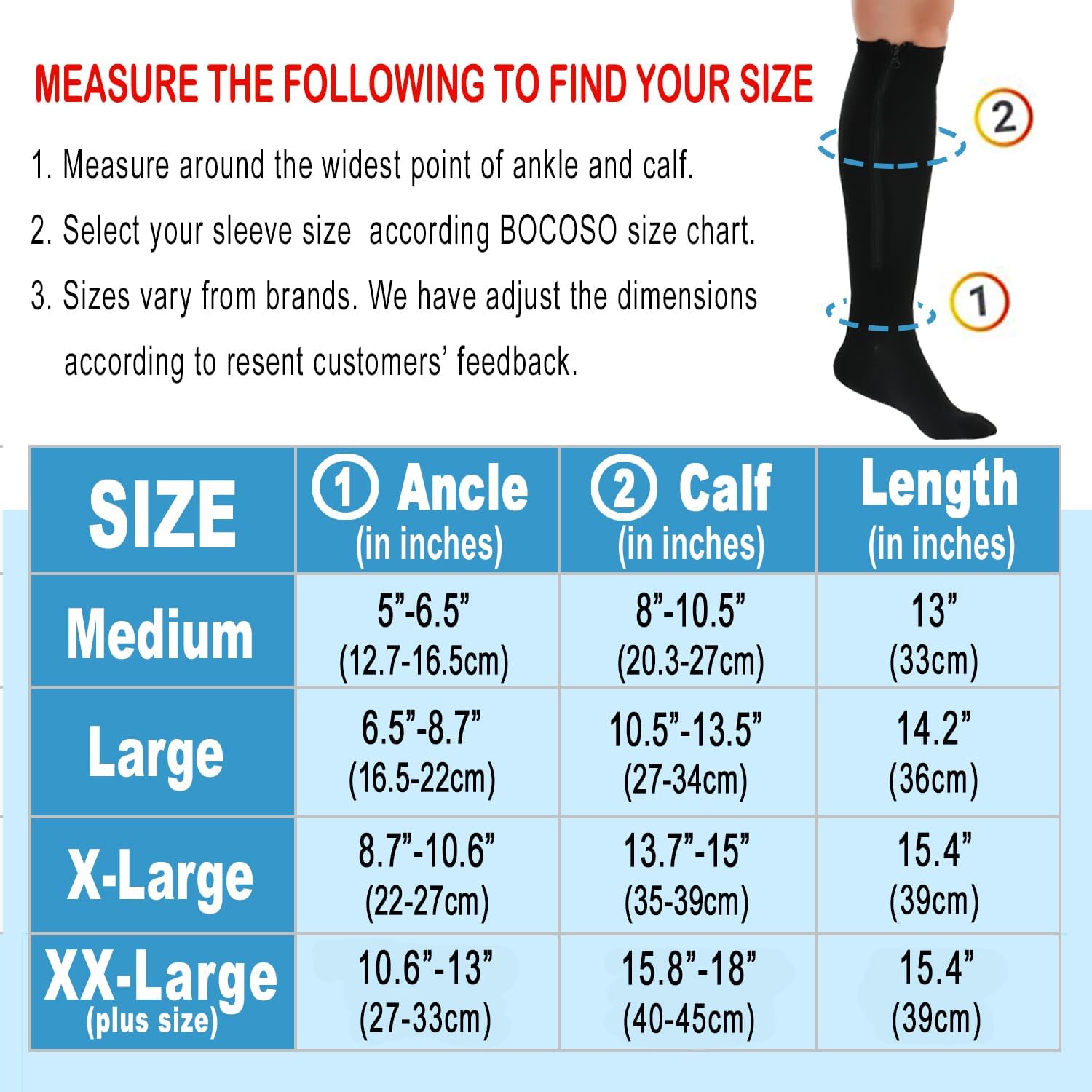 BEST WISHES AND ALWAYS BLESSING: BOCOSO hope zipper compression socks close toe will always stand by your side. We offer 100% no risk money back guarantee if you are not thrilled with your purchase for any reason, please rest assured to order. Your good mood and health are our top priorities. Size vary from difference brands. Use the size chart in the picture as a reference. If your measurements are between sizes, go to a bigger size.