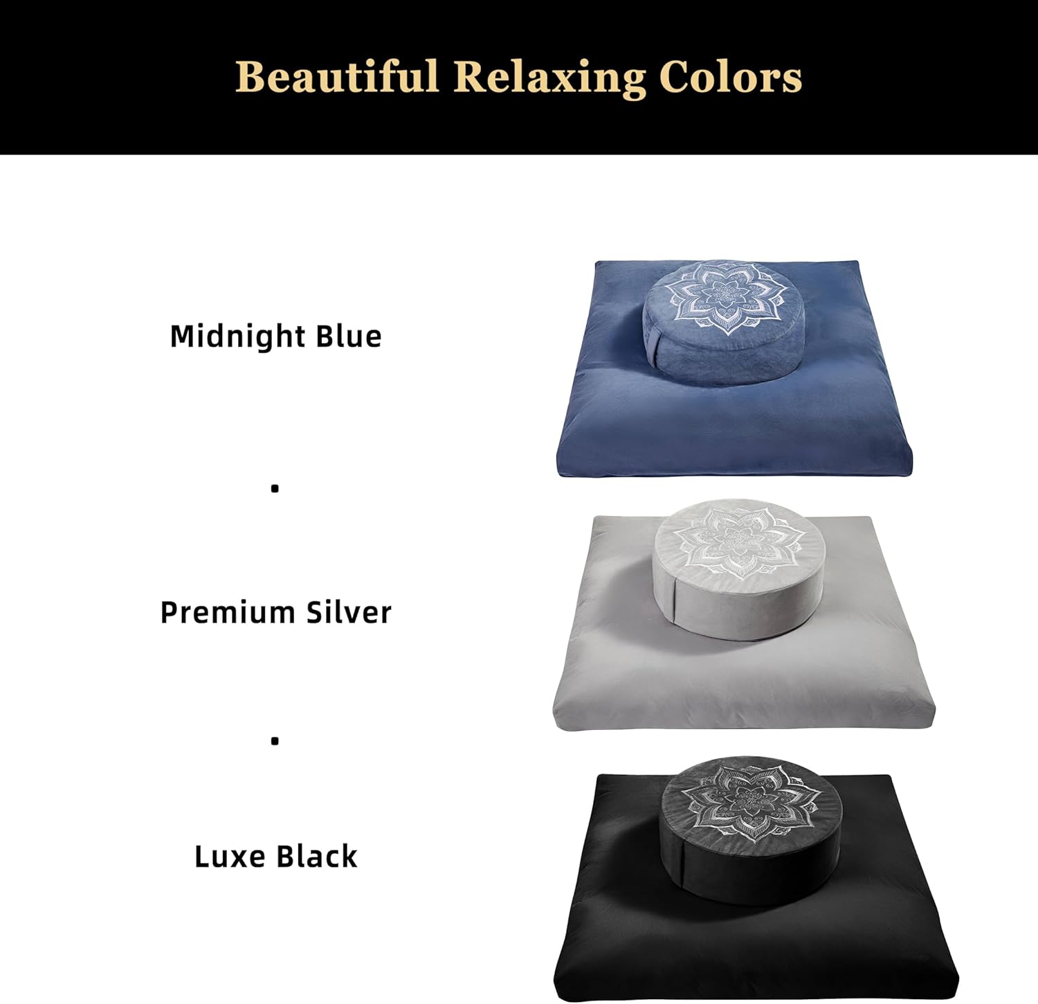 3、BEAUTIFUL LUXURY DESIGN:Each cover is crafted from a soft velvet fabric,with a mandala pattern beautifully embroidered on top,look great in any meditation room,yoga space,or living room.It can bring calming and restore energy to you during meditation or yoga practice, and can also be used as a floor pillow or chair for work and study at home