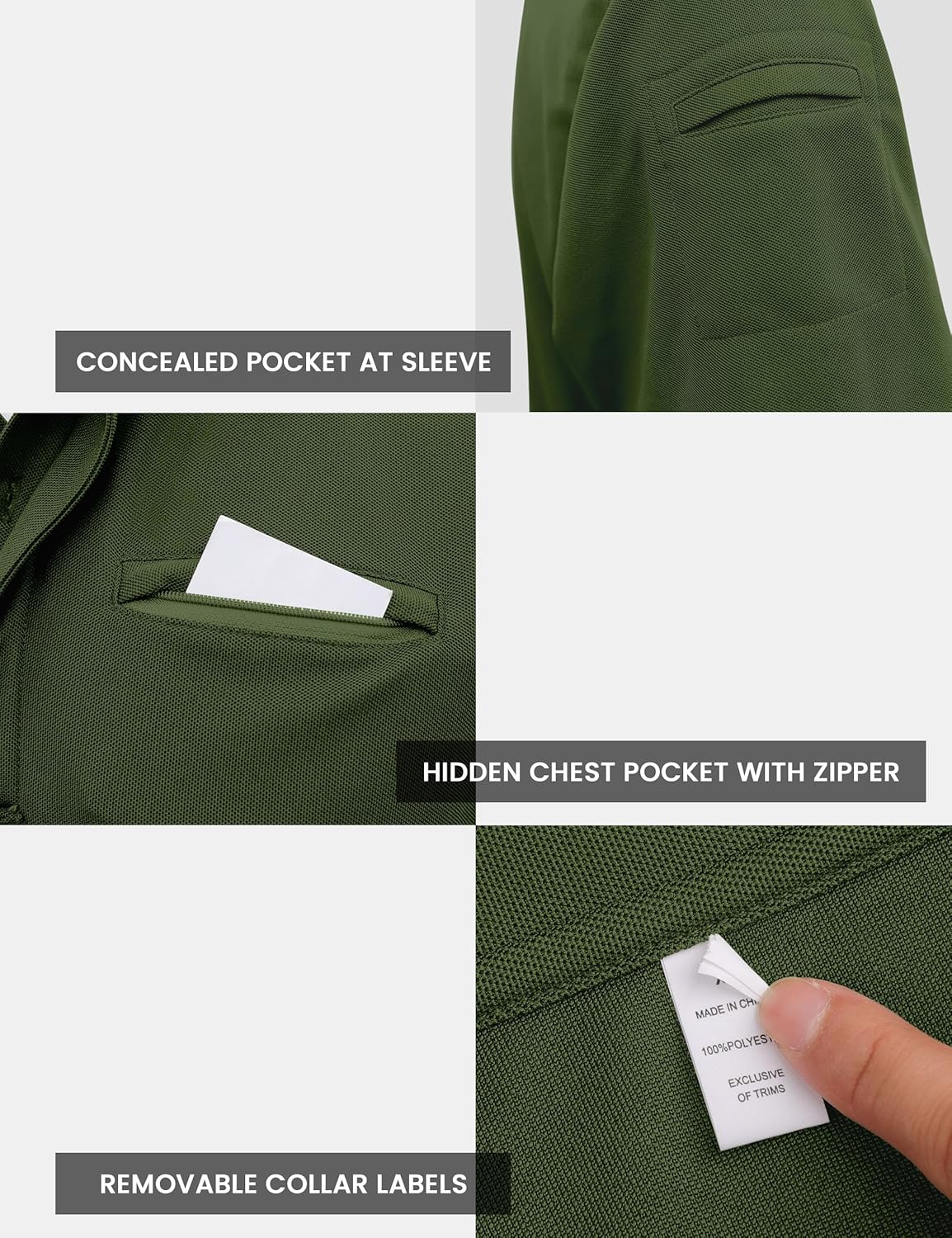 The shirt is made of 100% polyester and feels soft against my skin. There are two small pockets, one larger one with a zipper, located over the upper left part of your torso. Thereâs also a smaller, non-zippered one located on the right sleeve. It looks nice when wearing it and the collar feels good when touching my neck as well.It is breathable and after perspiring or getting it wet, it dries quickly. It was very resistant to tearing when I tested its durability. Thankfully, it is lightweight as well, which makes it good for exercising while looking stylish.When ordering, I ordered two sizes up from my usual to be safe. It still felt snug around my middle. I would order two sizes bigger if you want a comfortable fit. As a result, I feel like this shirt is not very true to size at all. The product listing does warn you about this and after wearing it myself, I would agree with it.Since this shirt is 100% polyester, it didnât shrink when I washed it. However, it is not entirely wrinkle-free while wearing or after washing.This shirt looked and felt great when worn around the office but has some sizing issues overall.