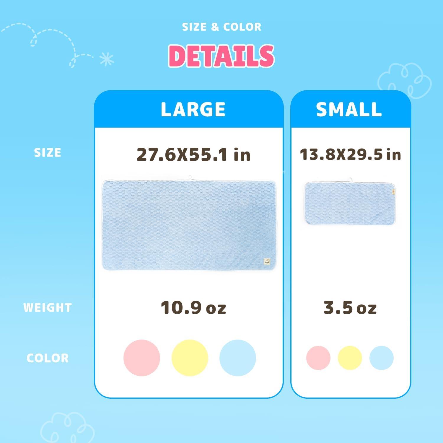 These towels are soft and absorbent. The smaller towel is perfect for face or paws. It dries quickly even due to its thickness.