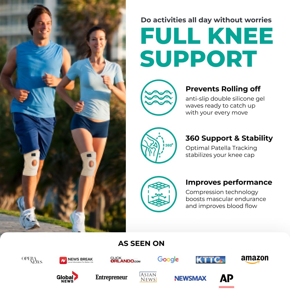 This is more of a heavy duty knee support. It has adjustable Velcro straps for customization, neoprene like material on the inside so very cushy. Has a gel donut insert to stabilize knee cap. I also like that this is a beige color so it doesnât scream âlook at my knee support!!!â Too bulky to wear under pants but fine if youâre wearing shorts.