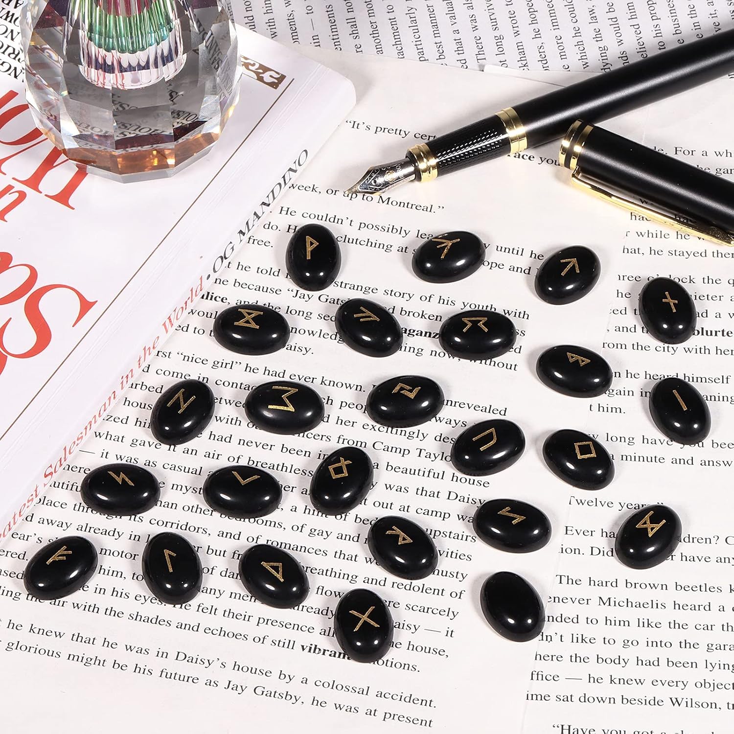 6 reviews for mookaitedecor Black Obsidian Crystal Rune Stones Set of 25, Flatback Cabochon Stone Engraved Elder Futhark Alphabet Symbol Wiccan Crystals for Divination and Healing